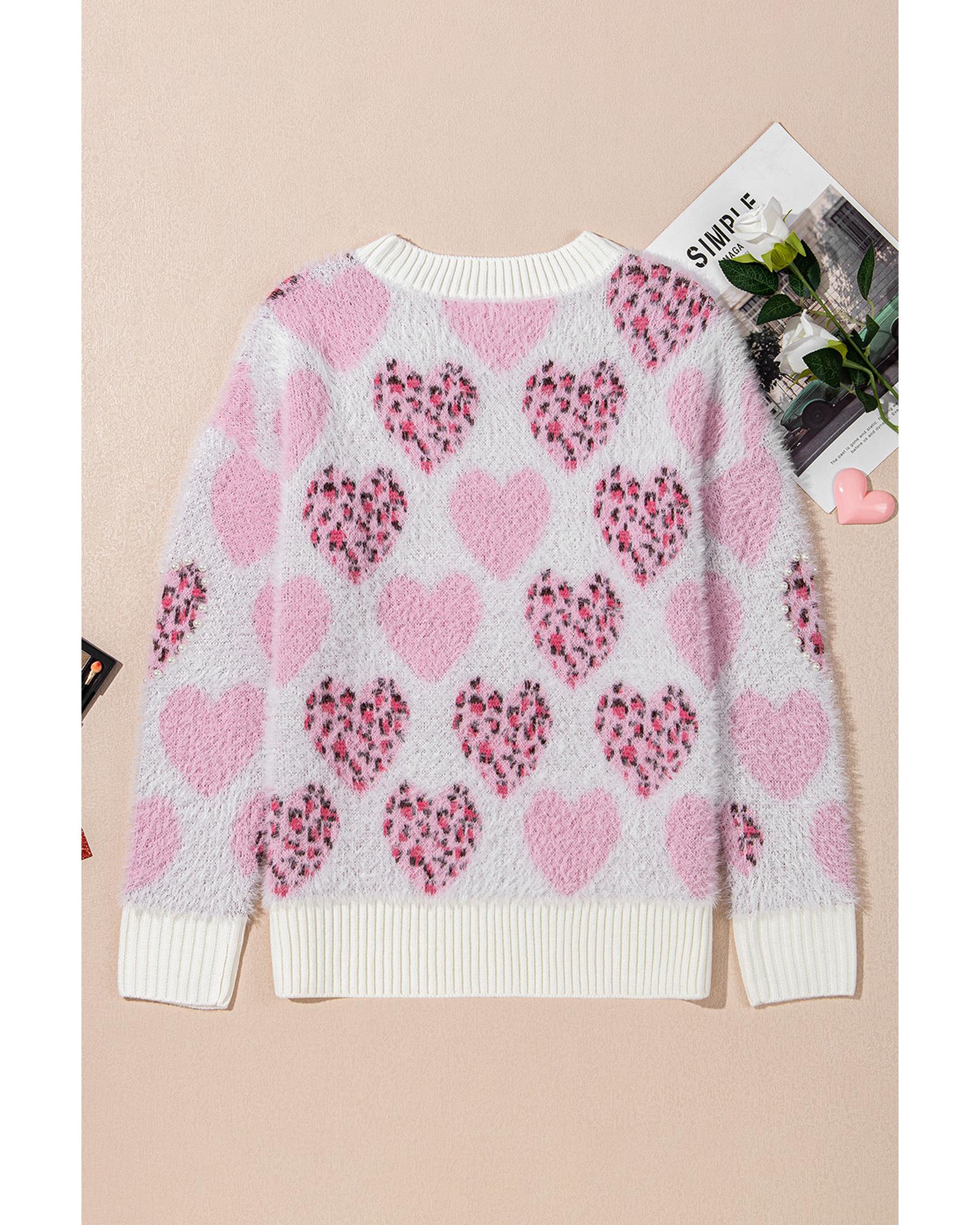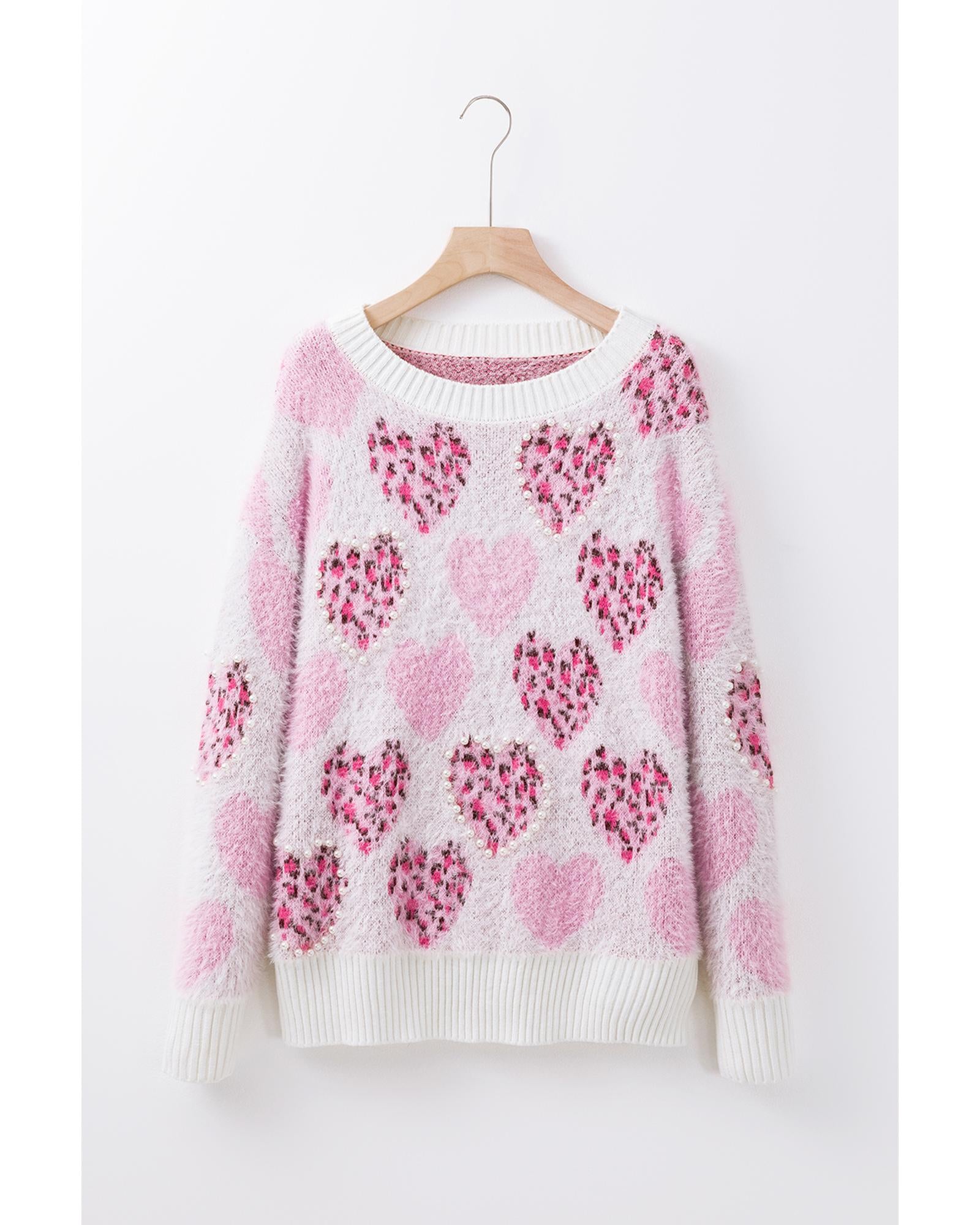 Pink Heart Leopard Print Pearled Ribbed Trim Fuzzy Sweater - S