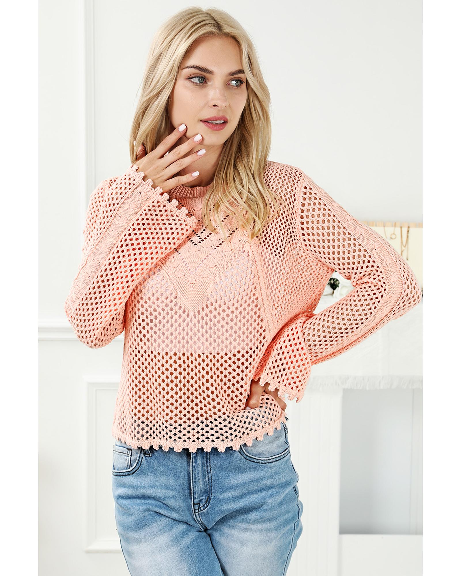 Pink Hollowed Eyelets Knit Bell Sleeve Sweater - S