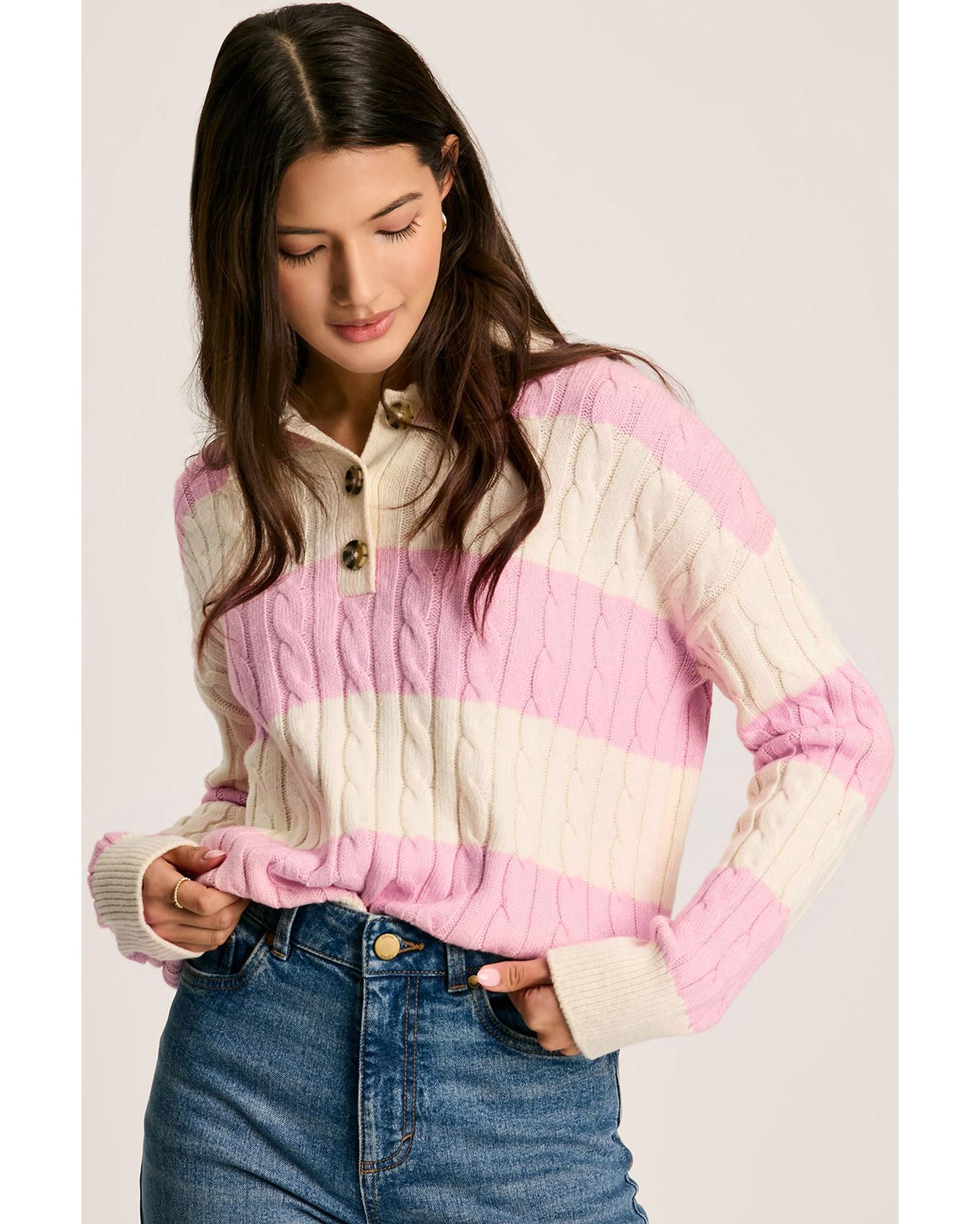 Pink Stripe Cable Knit Collared Henley Sweater - L