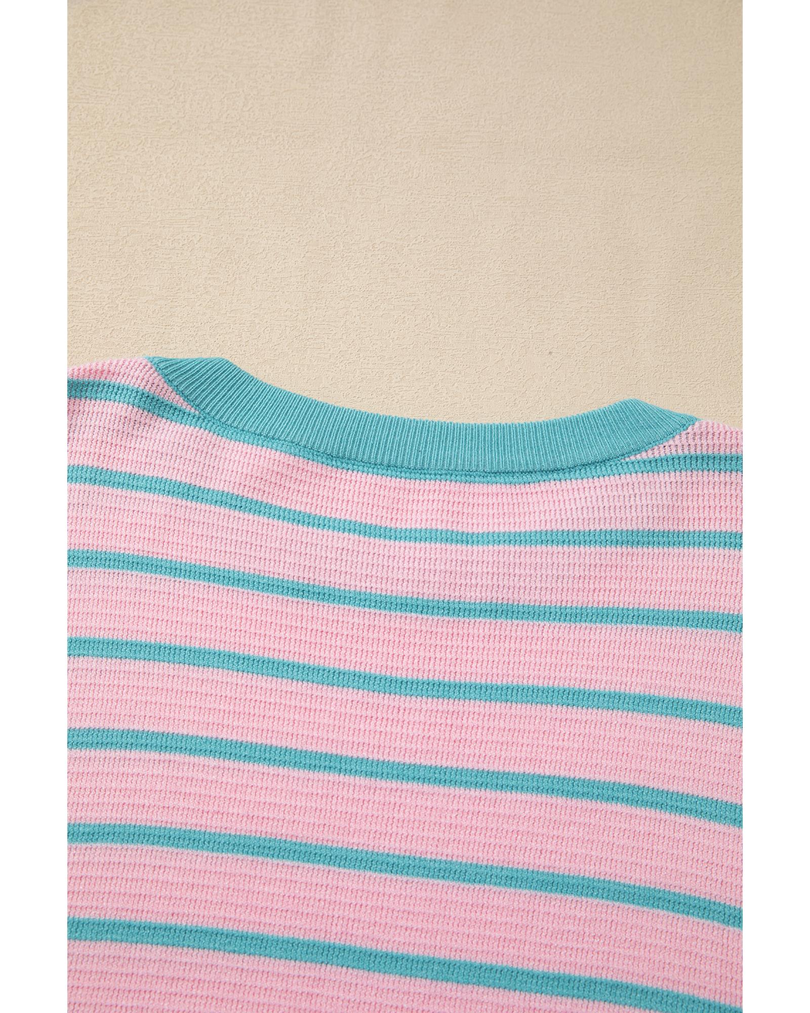 Pink Stripe Trimmed Round Neck Drop Shoulder Loose Sweater - L