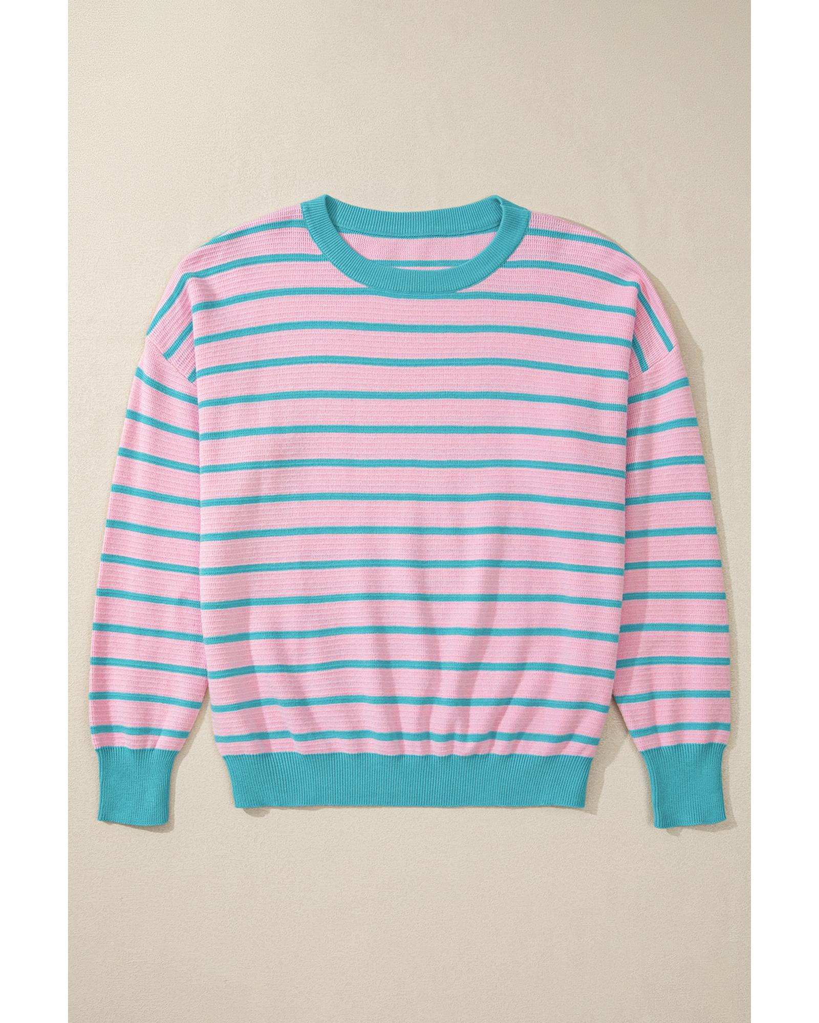 Pink Stripe Trimmed Round Neck Drop Shoulder Loose Sweater - S