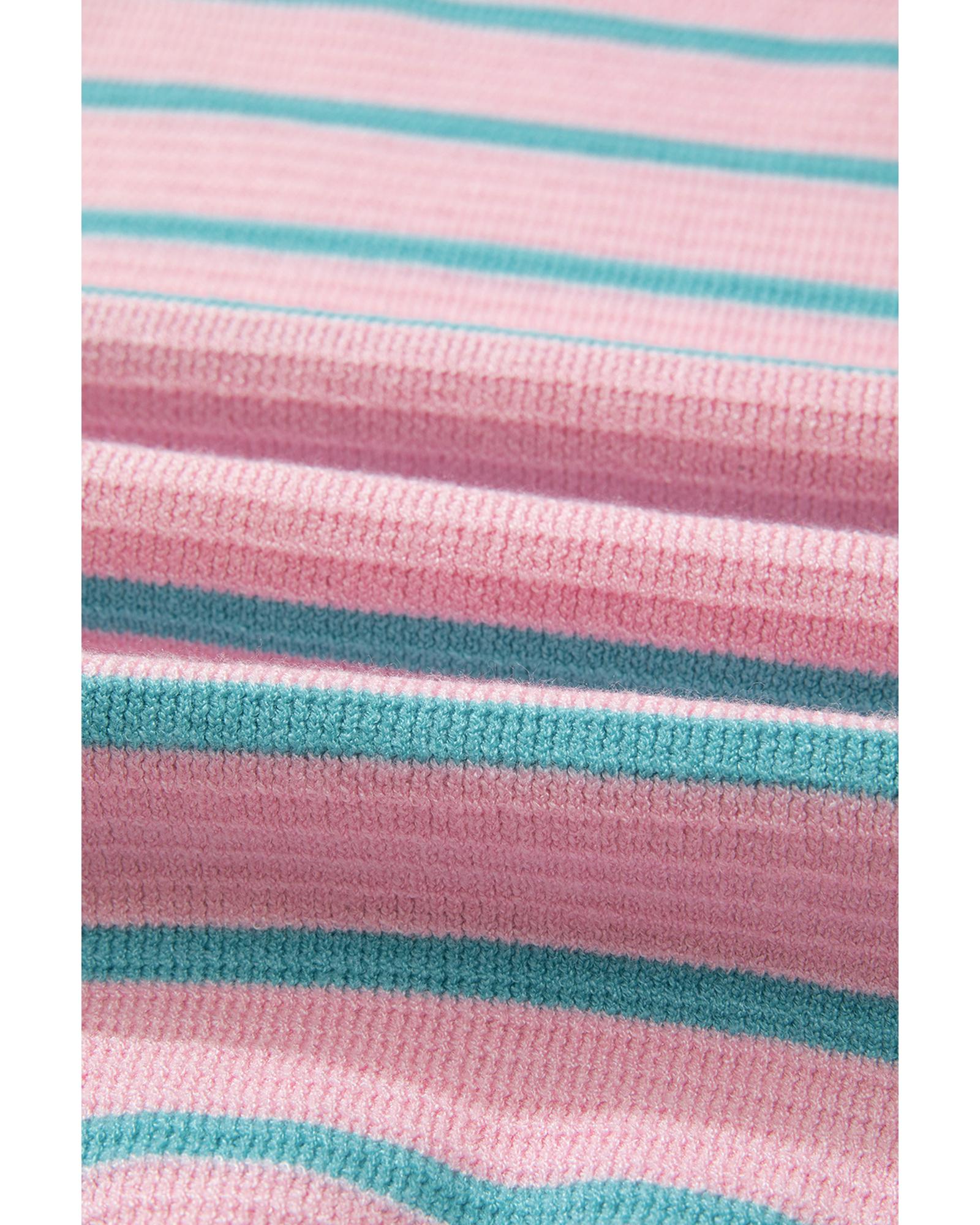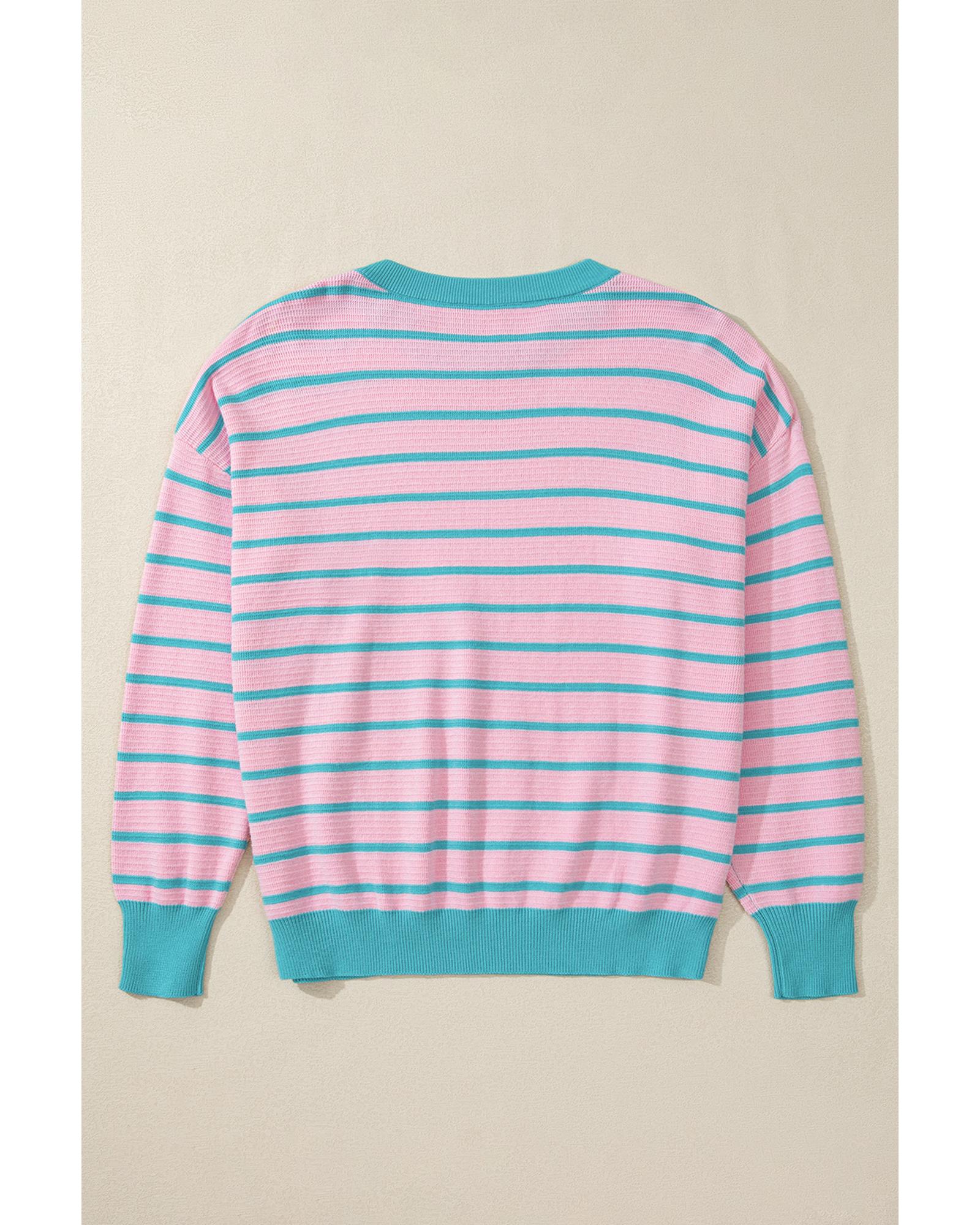 Pink Stripe Trimmed Round Neck Drop Shoulder Loose Sweater - XL