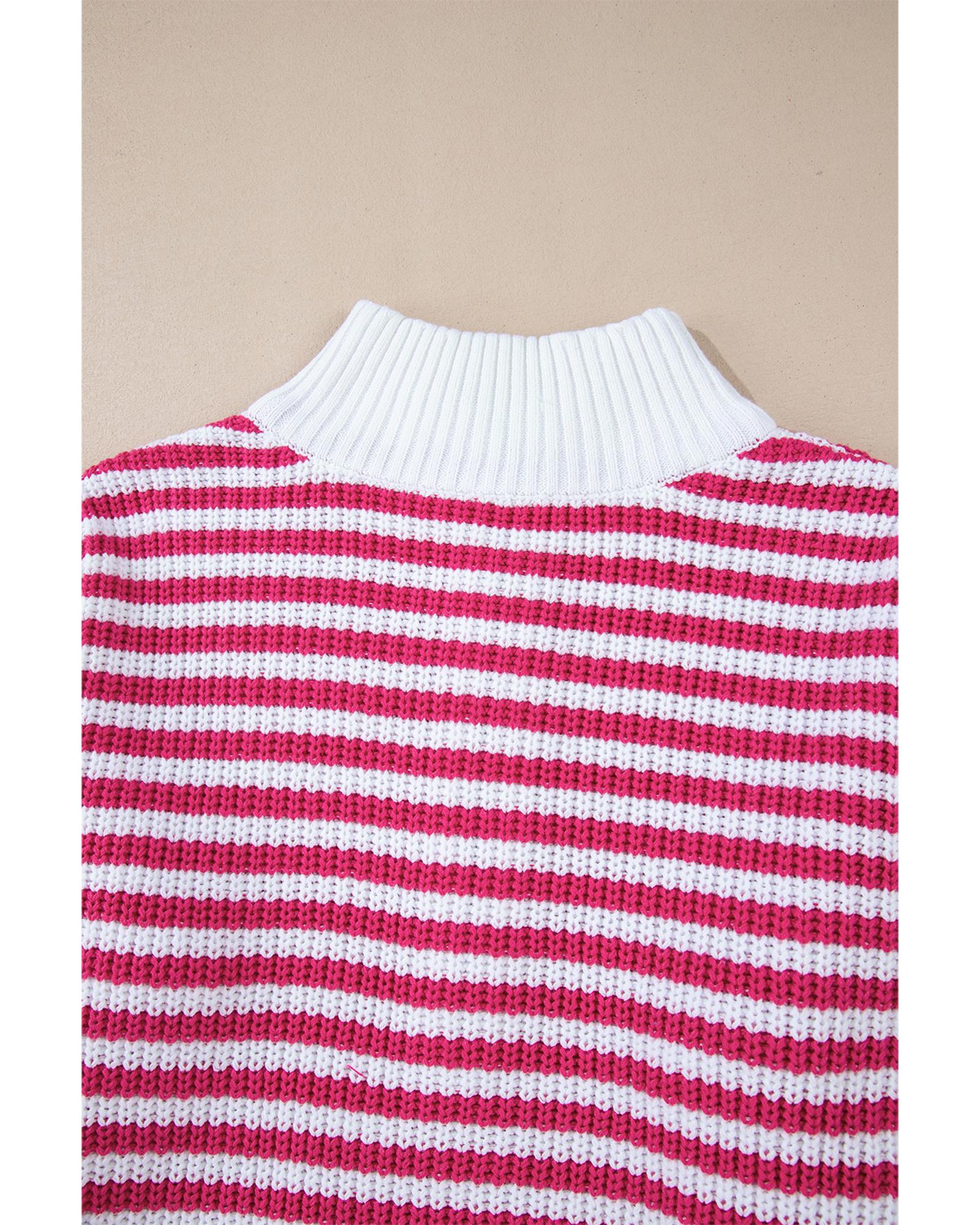 Pink Stripe Zip up Collar Drop Shoulder Sweater - L