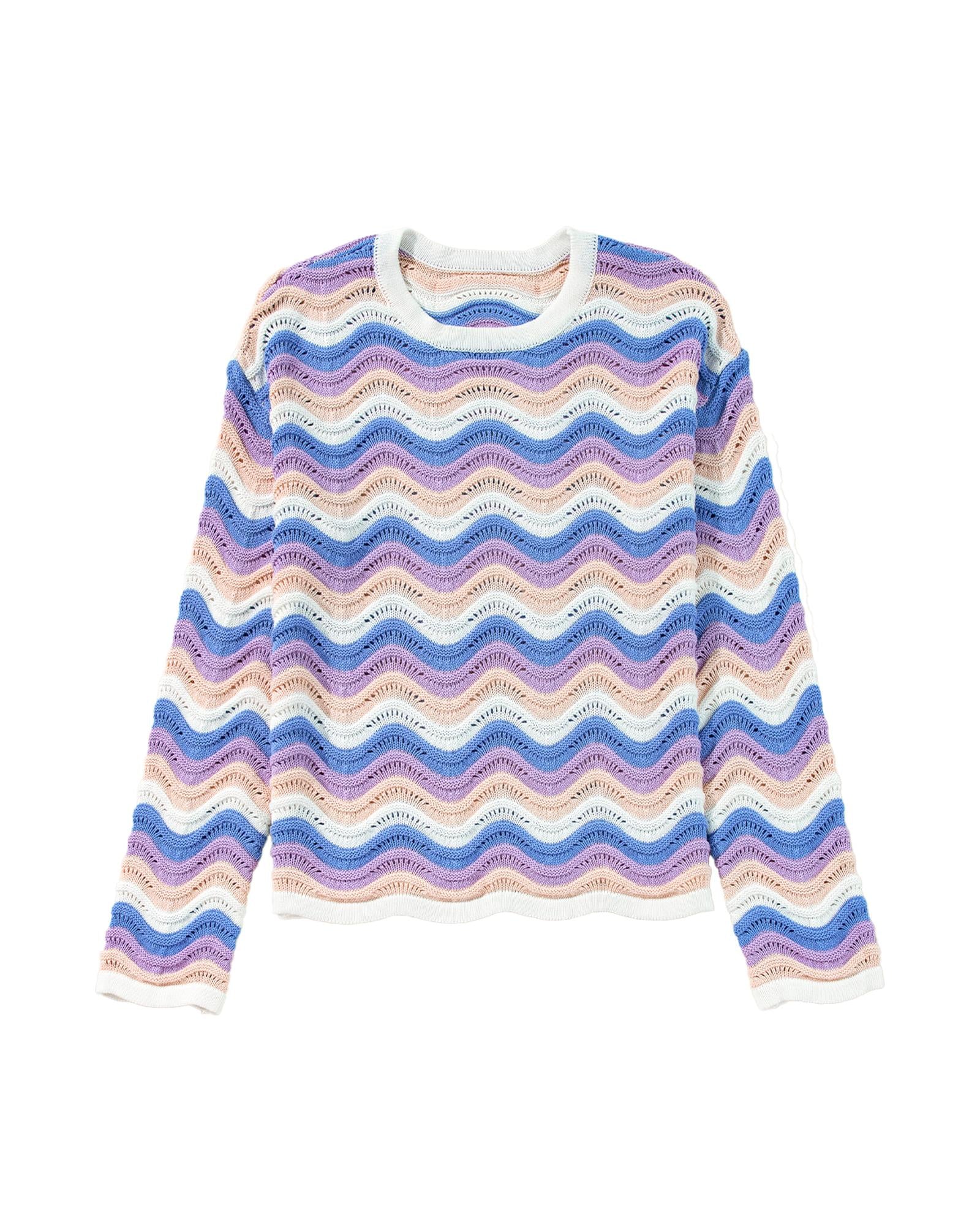 Purple Stripe Wavy Pointelle Knit Drop Shoulder Sweater - XL