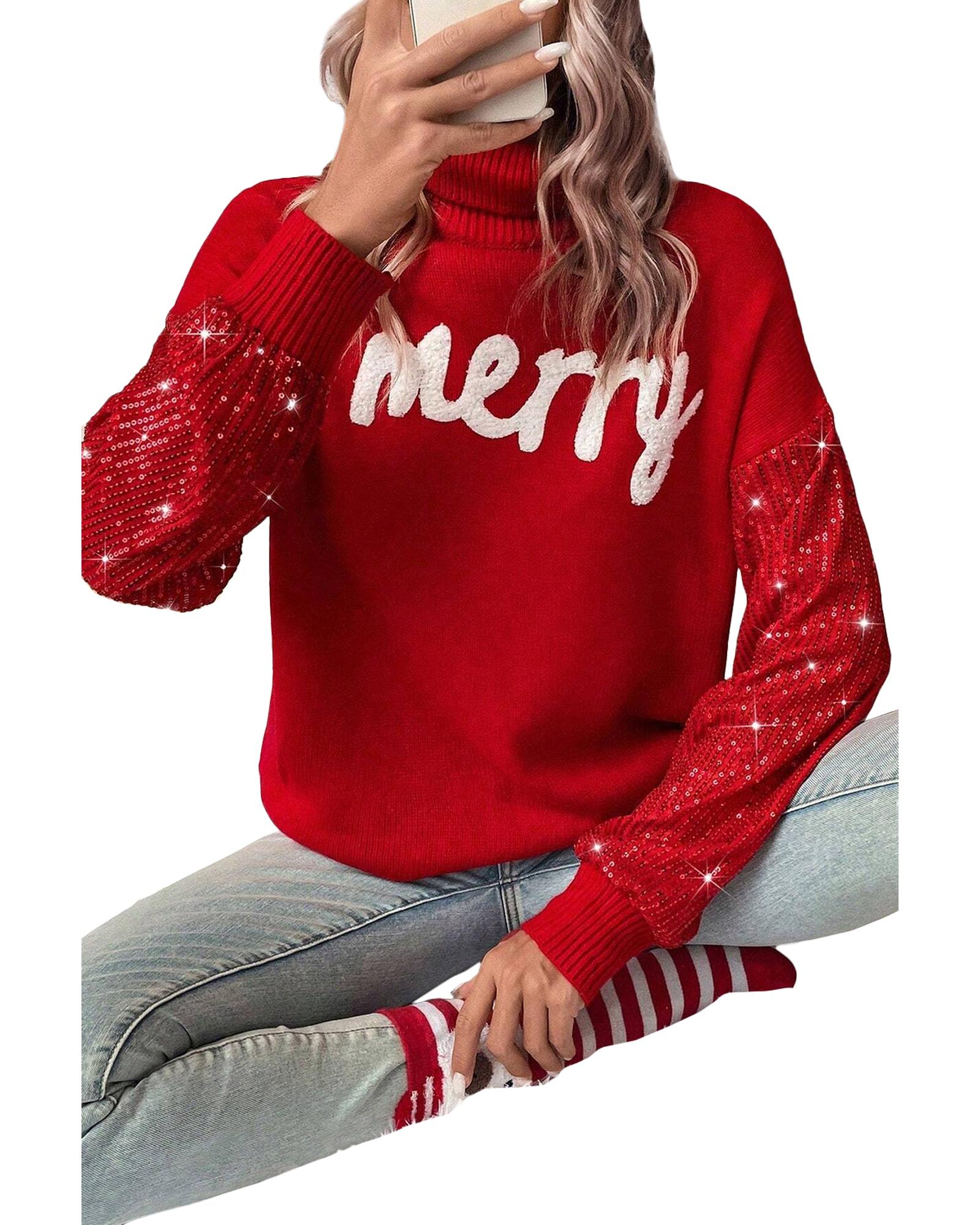 Racing Red Merry Graphic Sequin Sleeves Christmas Turtleneck Sweater - 2XL
