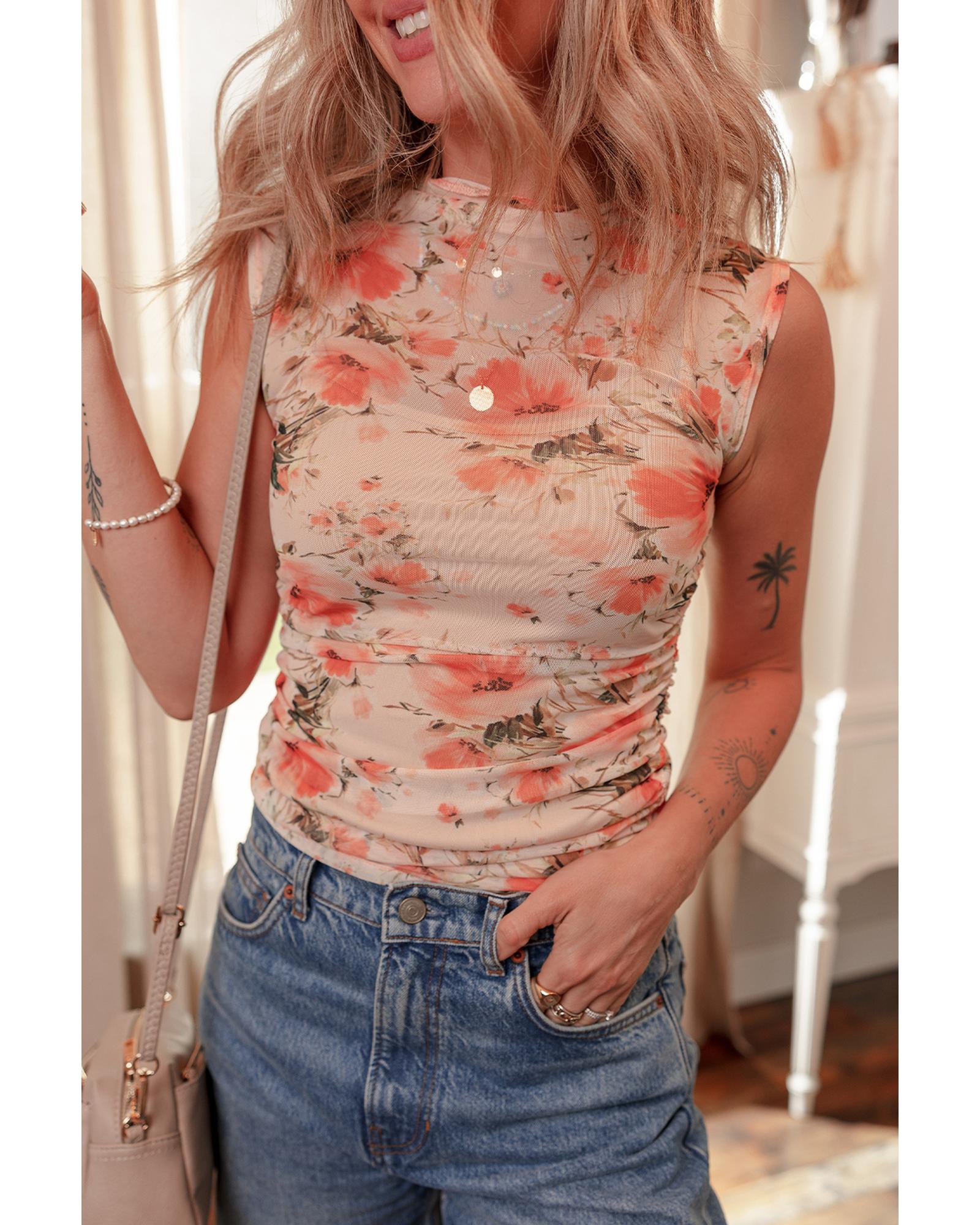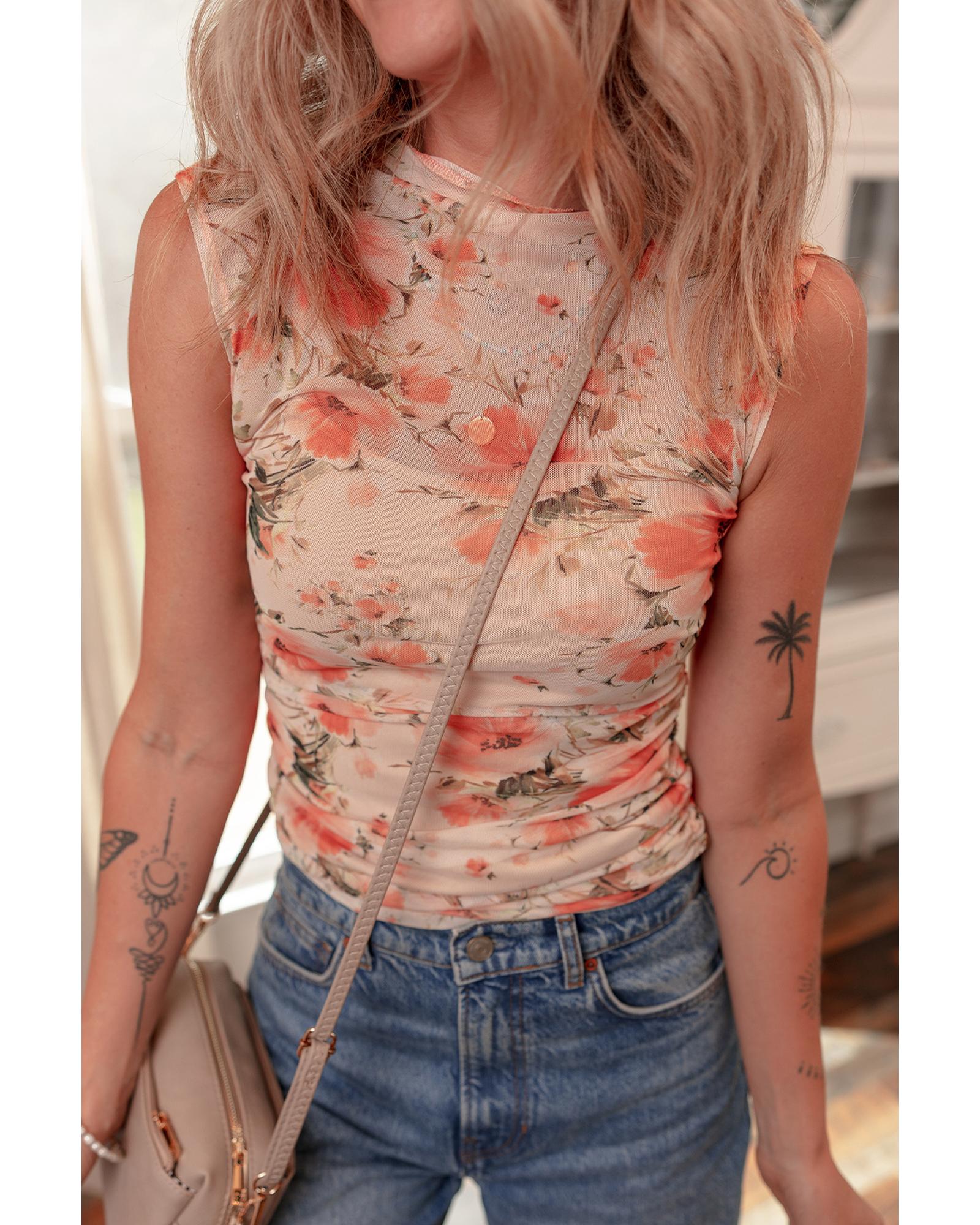 Red Mesh Floral Printed Slim Fit Tank Top - L
