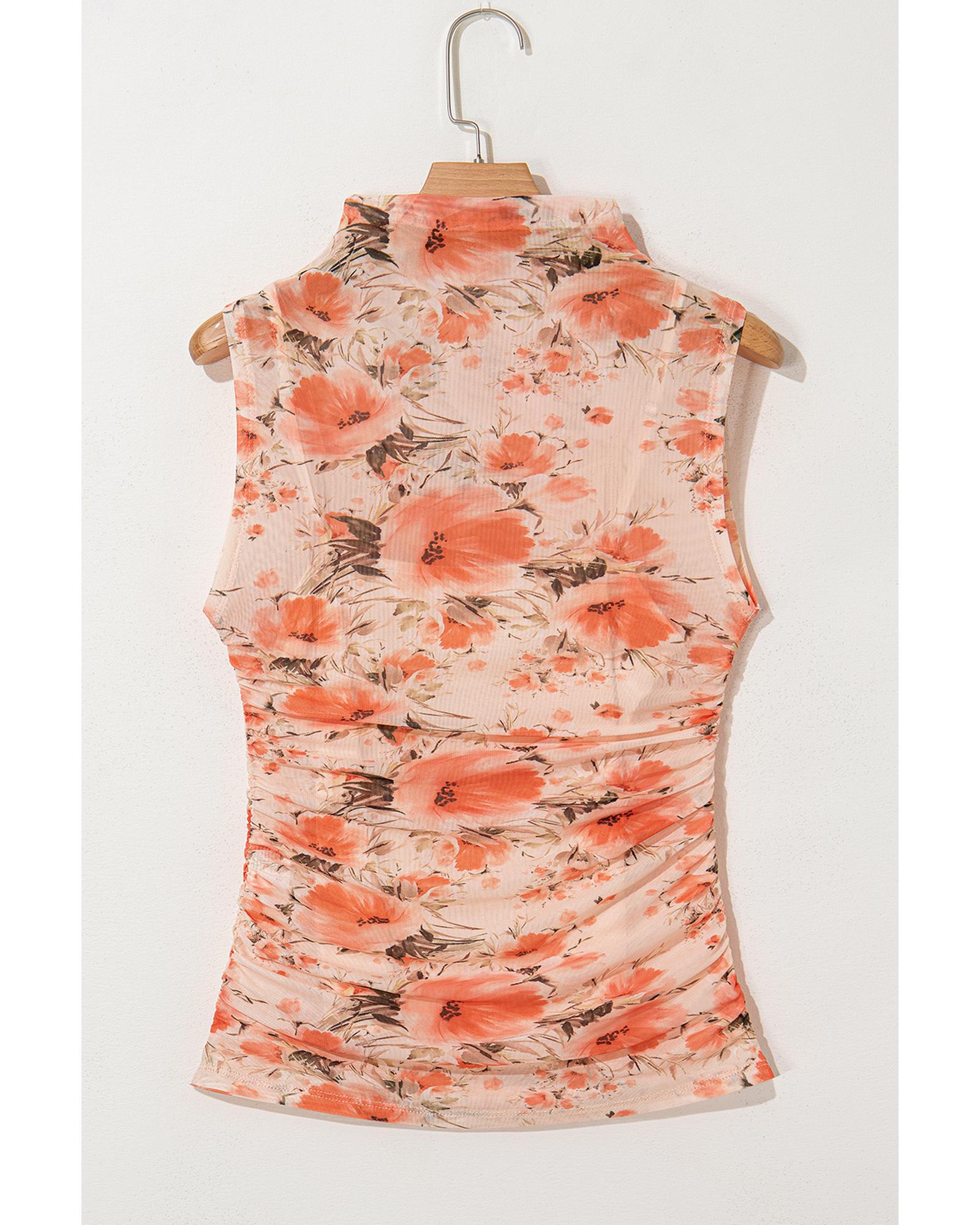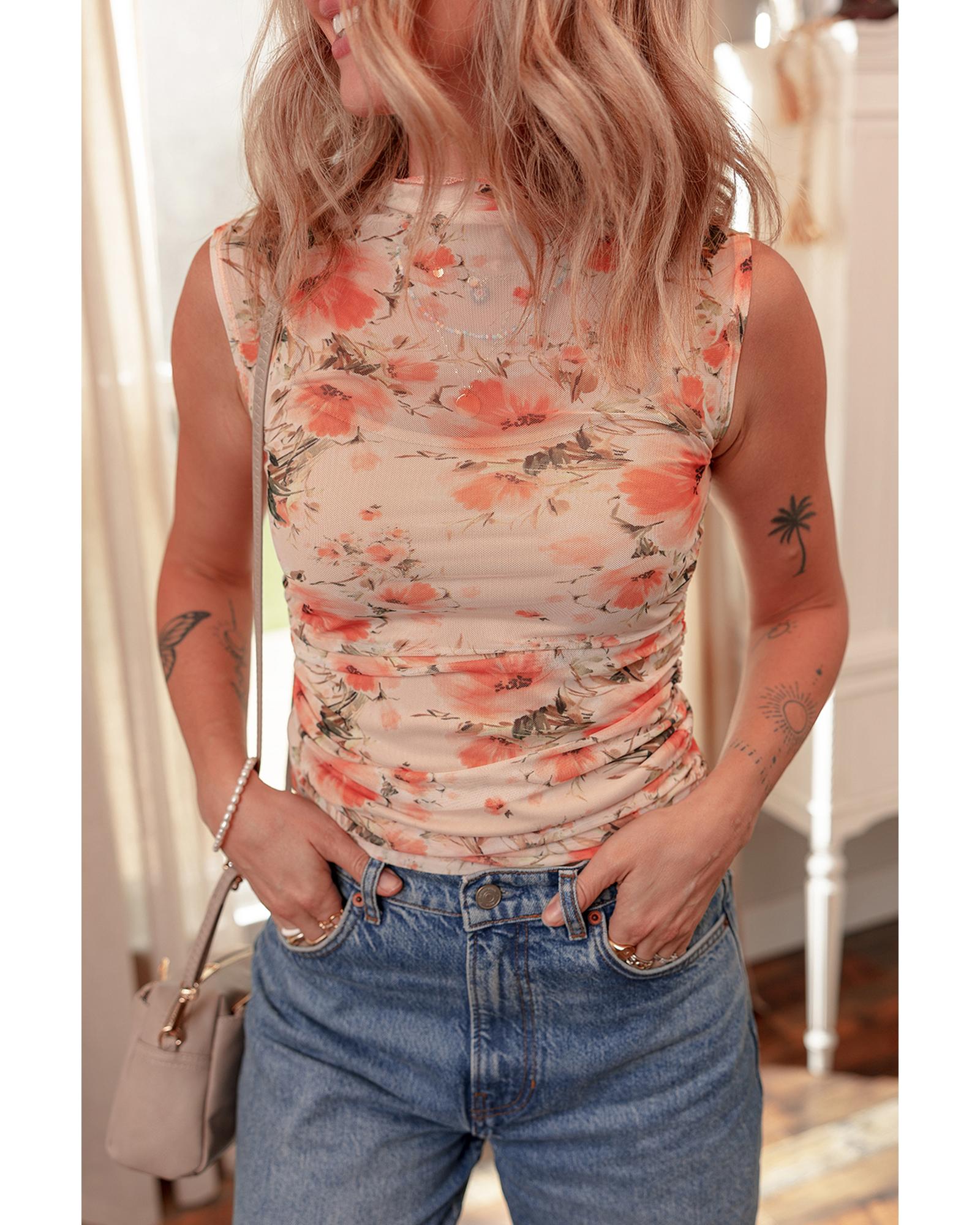 Red Mesh Floral Printed Slim Fit Tank Top - XL