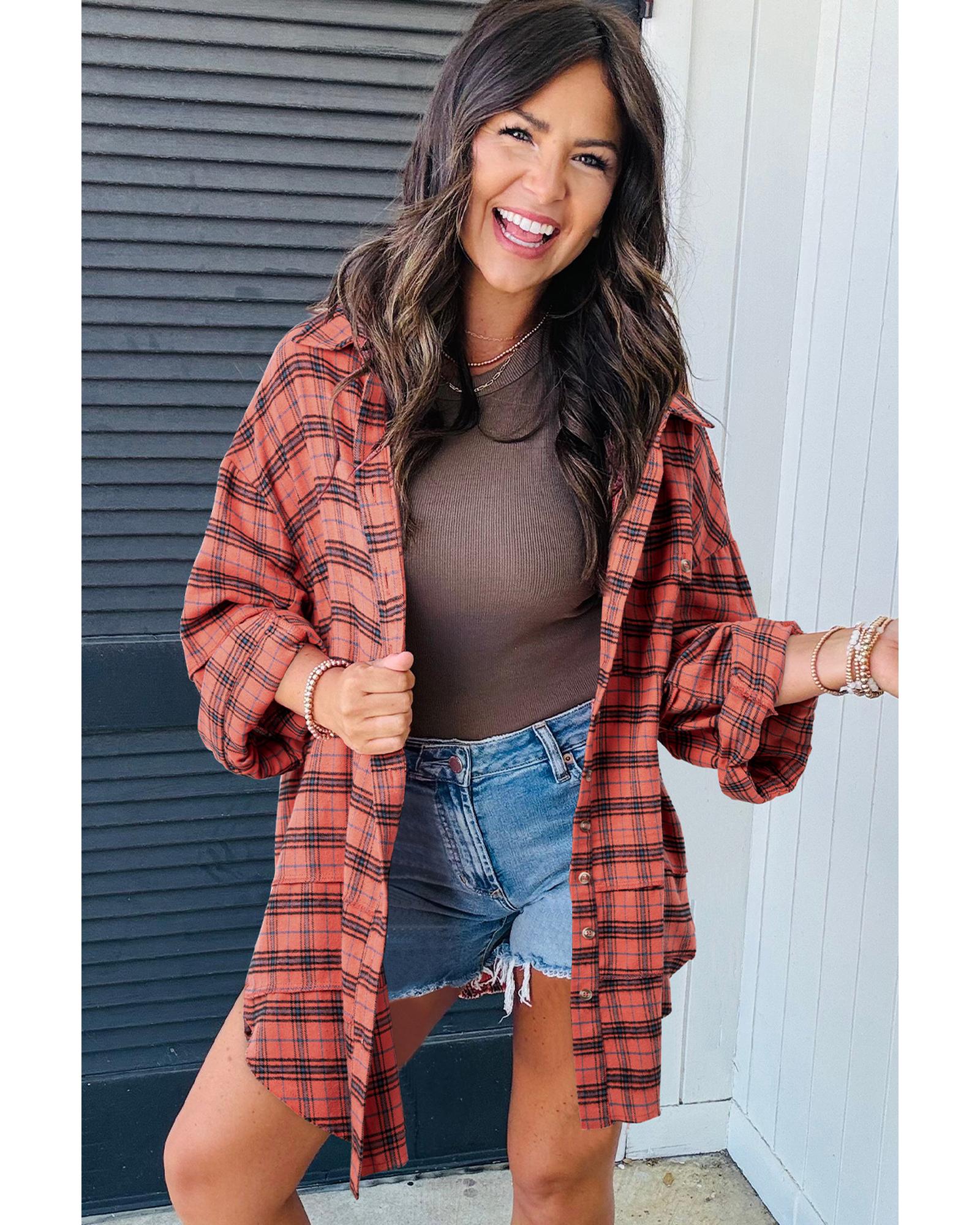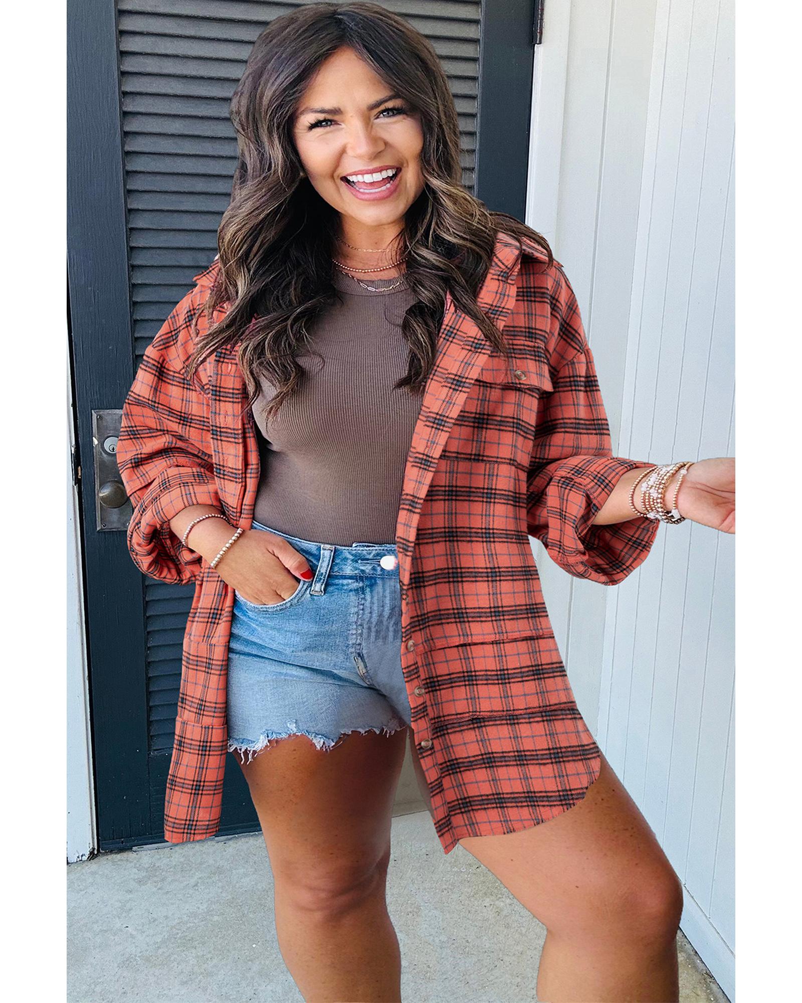 Red Plaid Long Sleeeve Side Split Distressed Hem Shirt - XL