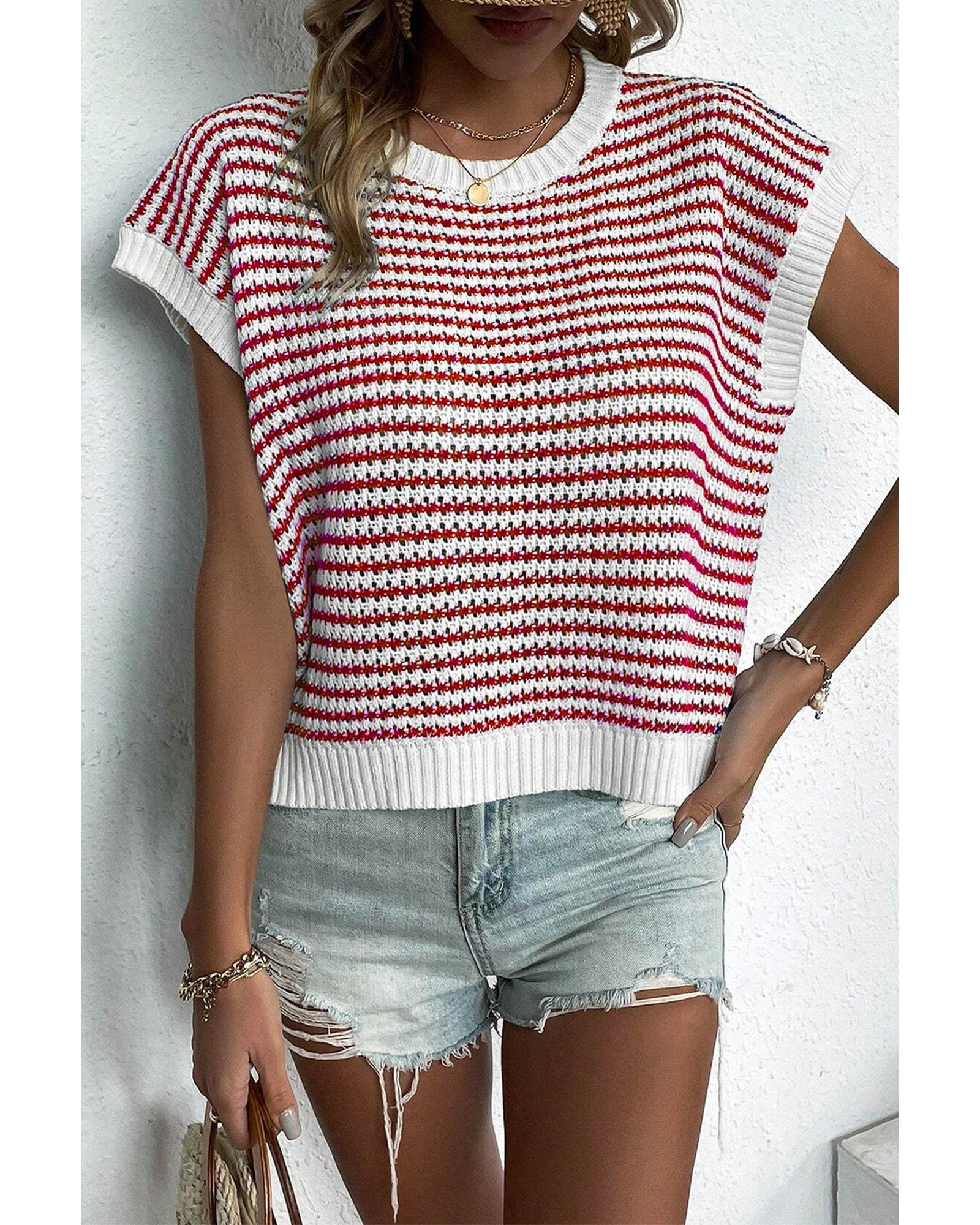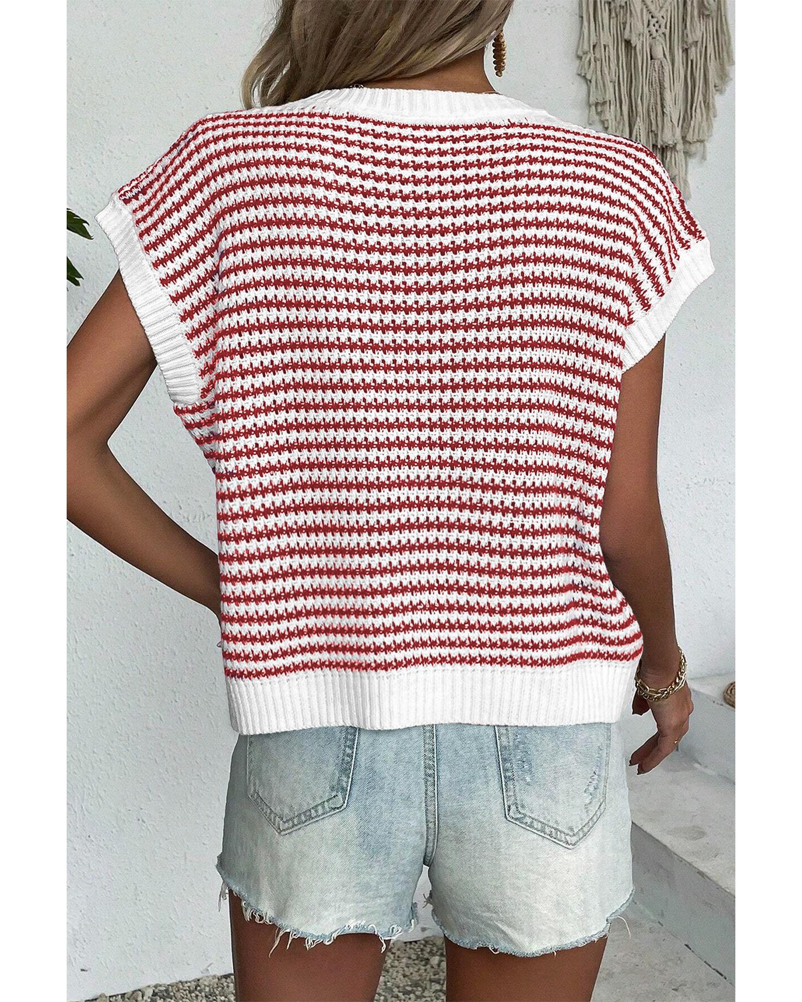 Red Stripe Ribbed Trim Loose Fit Knitted Sweater Vest - L