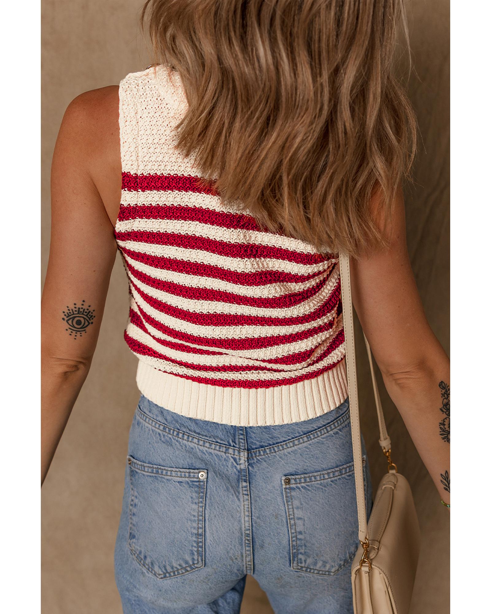 Red Stripe Textured Knit Ribbed Hem Sweater Tank Top - S