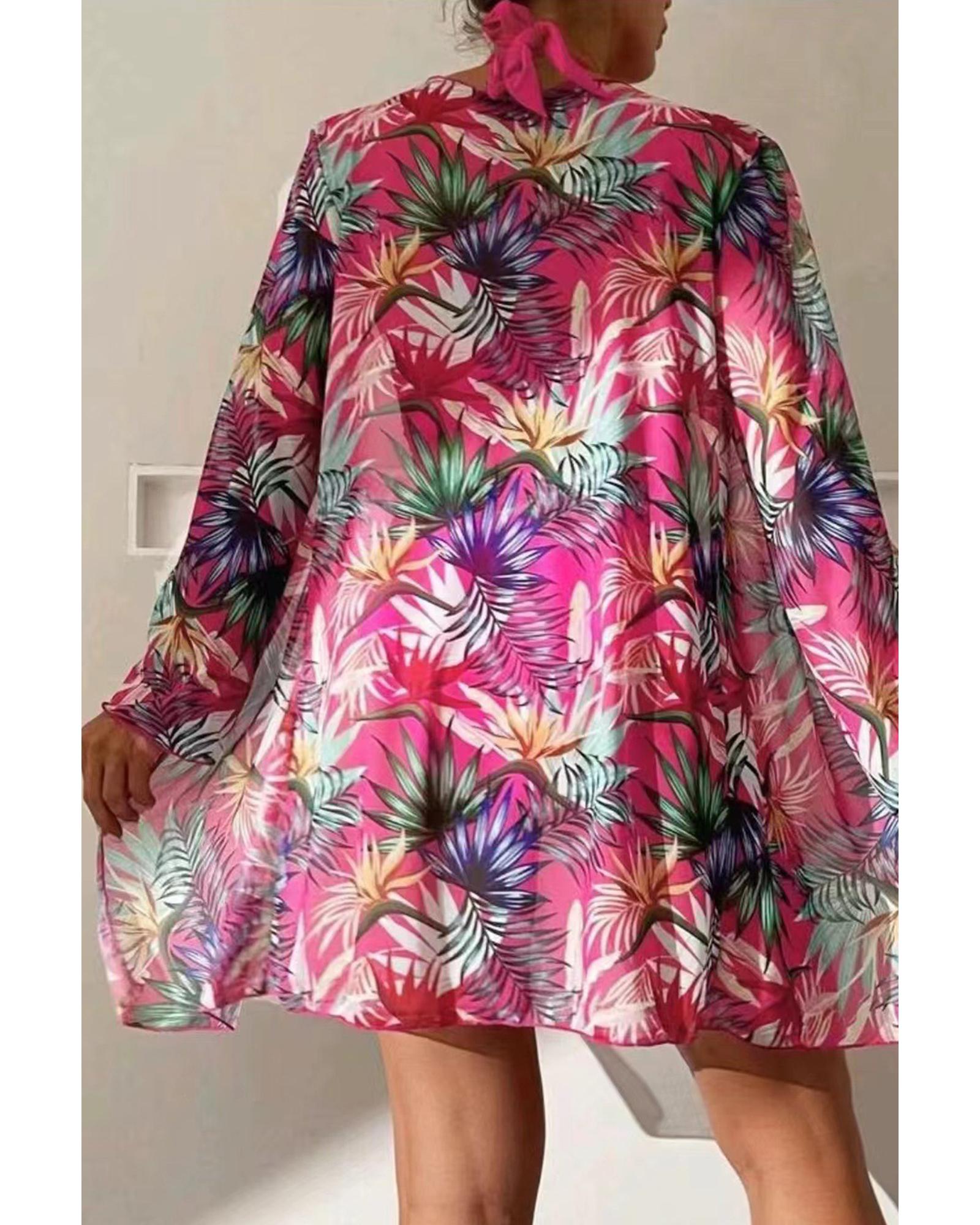 Rose Red 3pcs Tropical Contrast Trim Halter Bikini Set with Cover up - S
