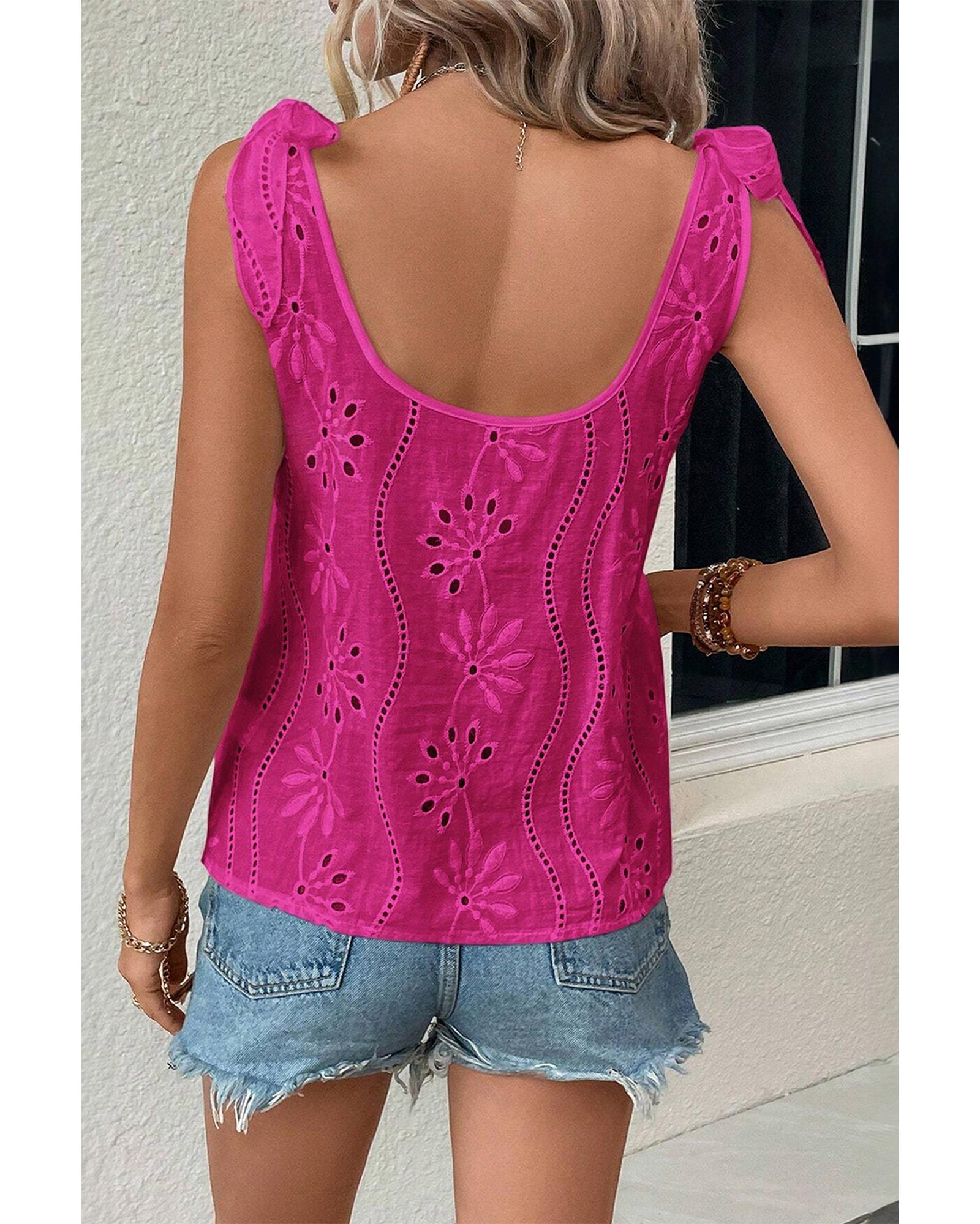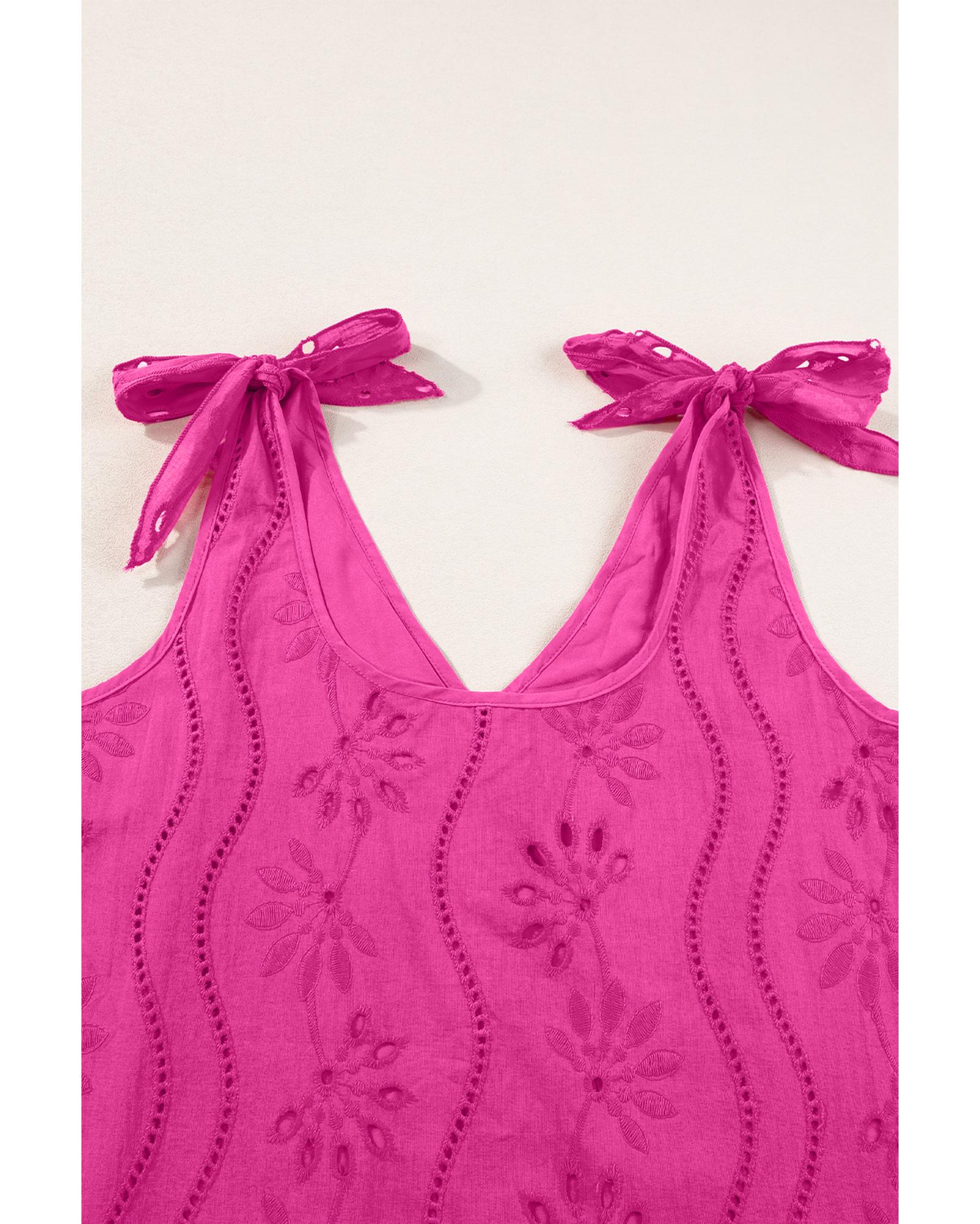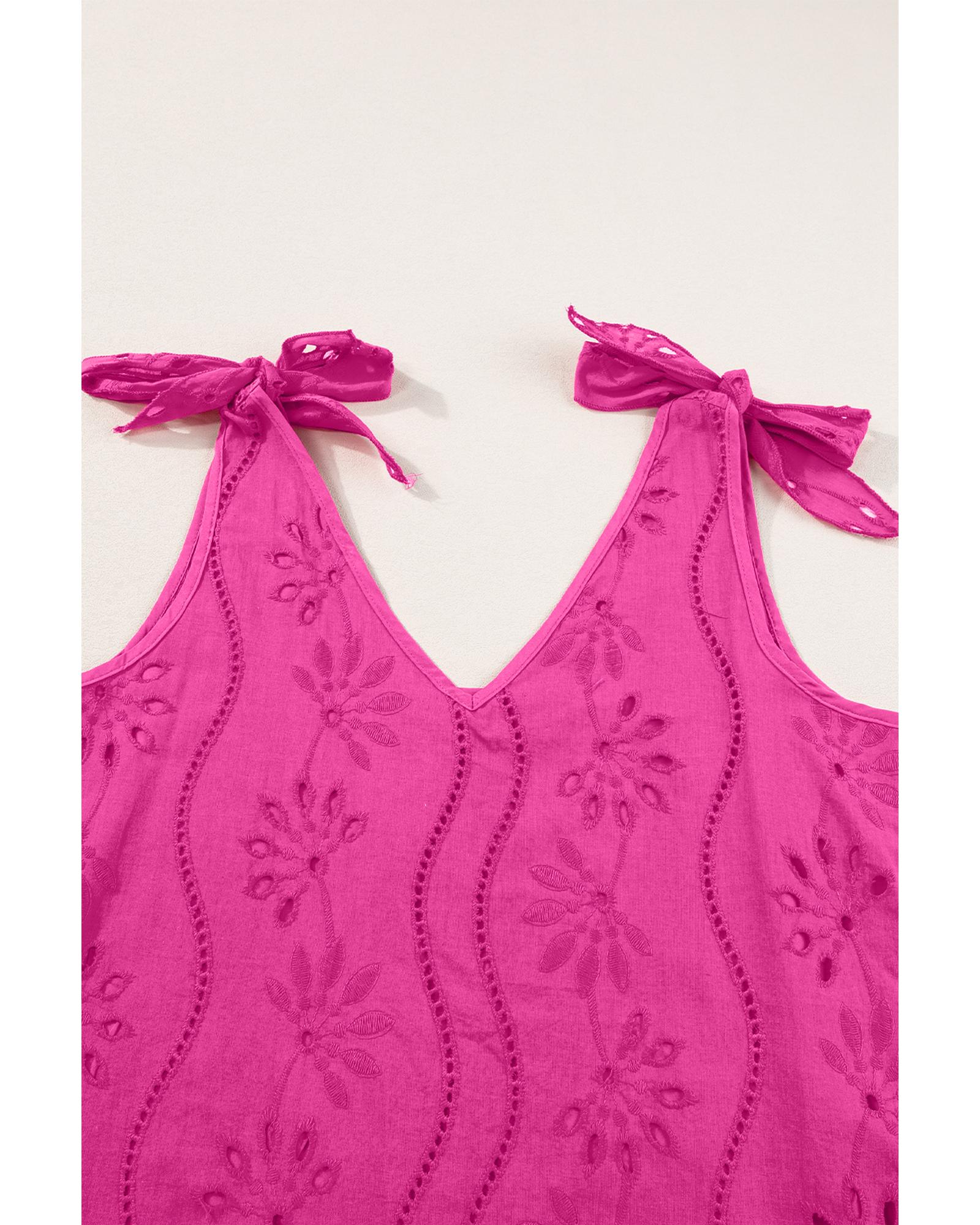 Rose Red Embroidery Patterned Knotted Straps V Neck Tank Top - S