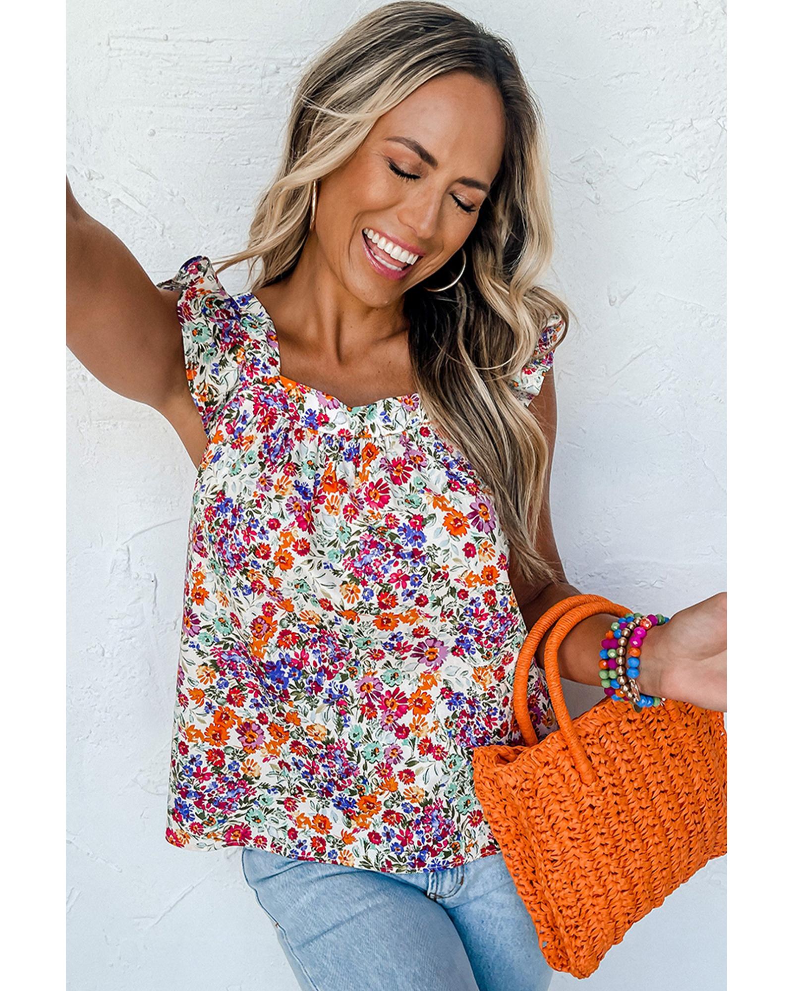 Rose Red Floral Square Neck Flutter Tank Top - L