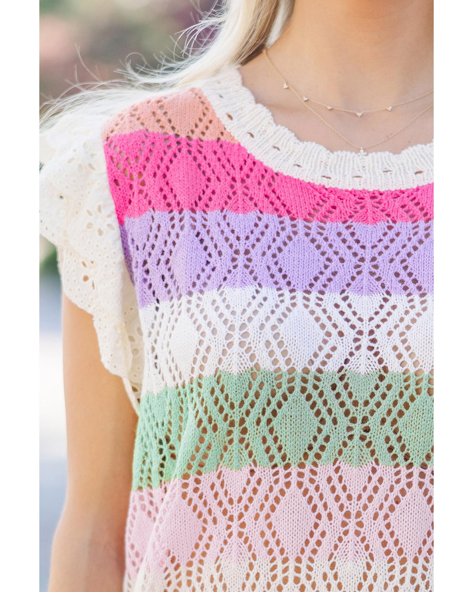 Rose Stripe Colorblock Hollowed Knit Scallop Edge Sweater Vest - M