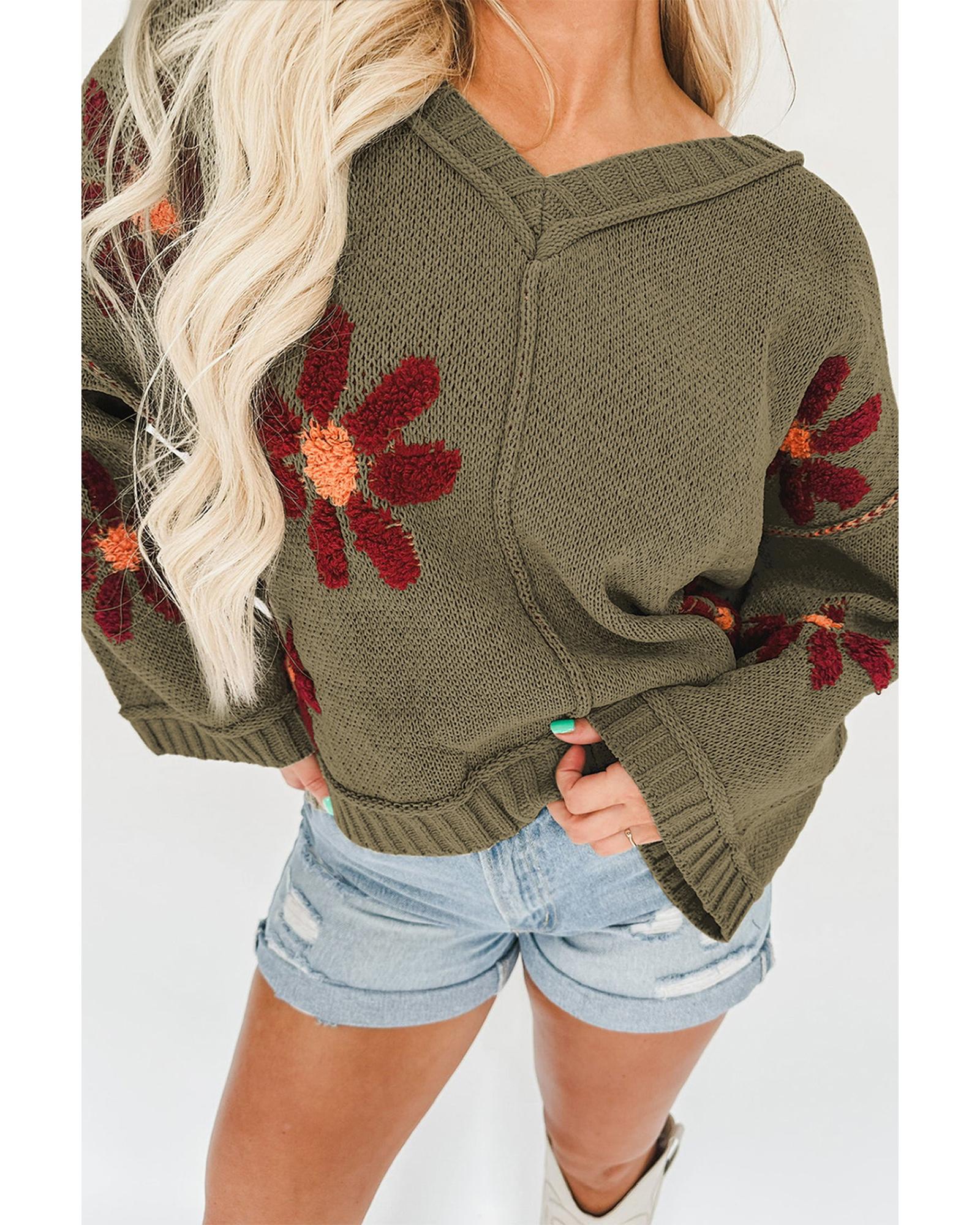 Sage Green Flower Knit Ribbed Trim V Neck Sweater - XL