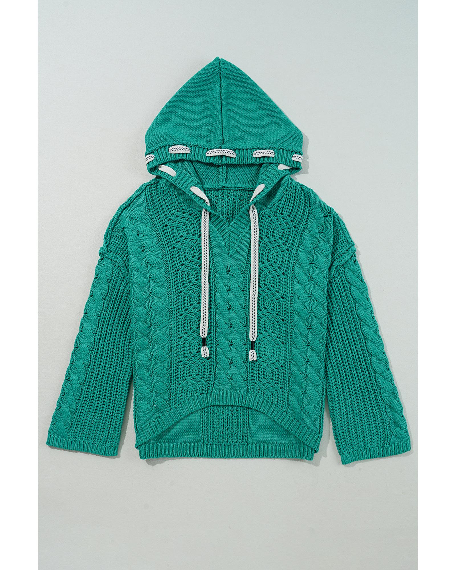 Sea Green Cable Knit V Neck Contrast Drawstring Hooded Sweater - S