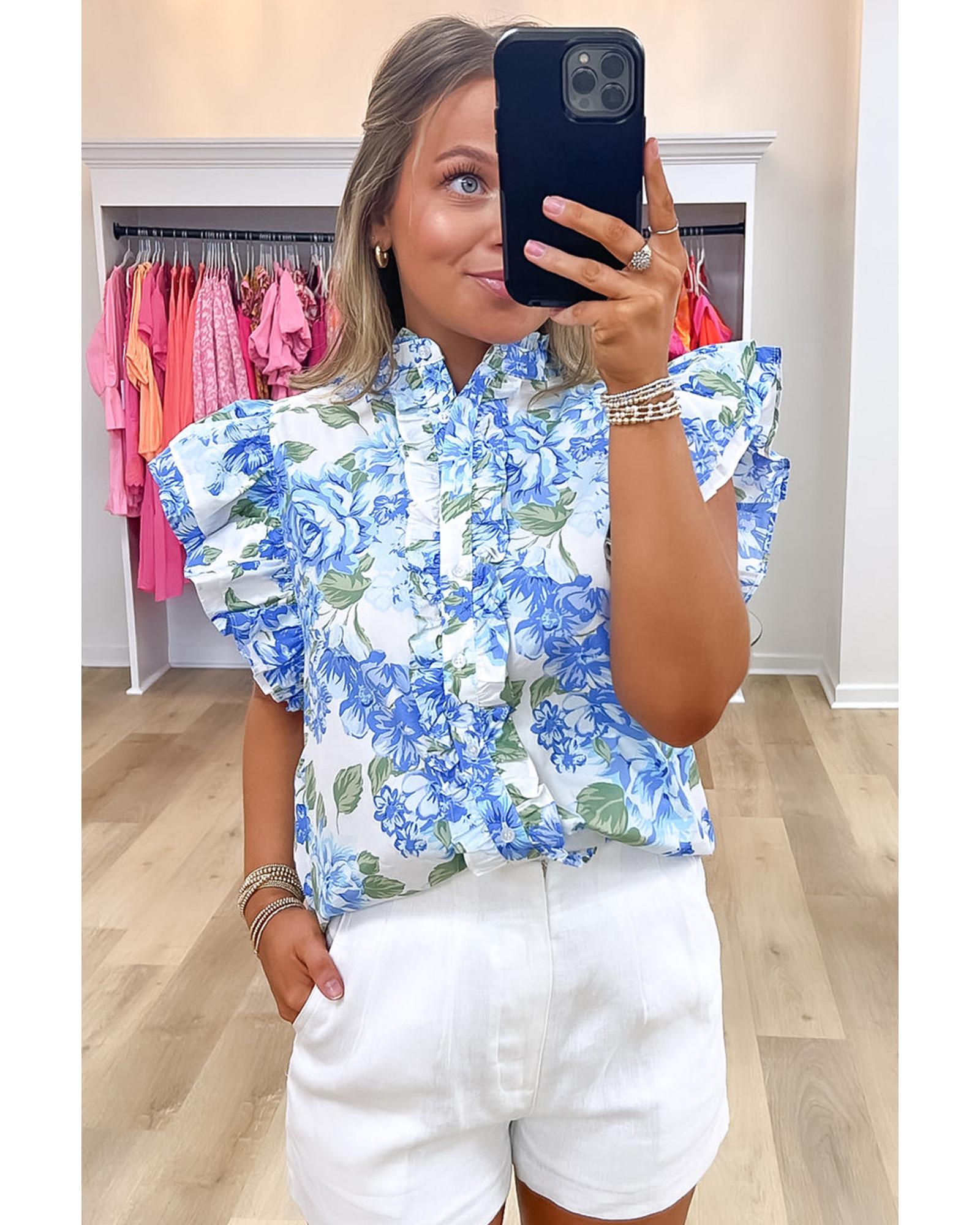 Sky Blue Floral Print Ruffle Sleeve Frilly Button Up Shirt - M