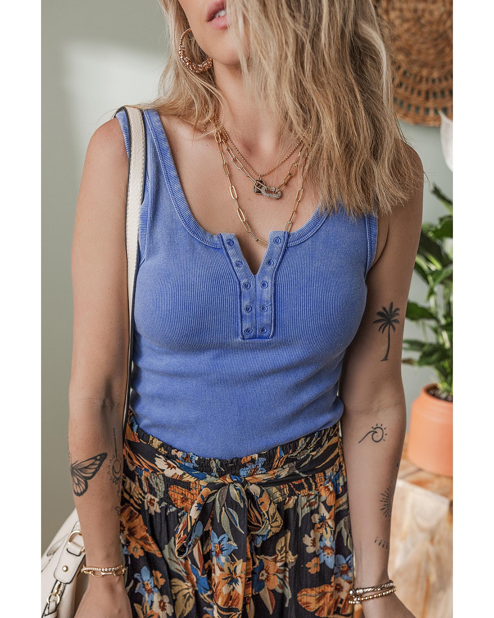 Sky Blue Mineral Wash Ribbed Notch Neck Tank Top - L