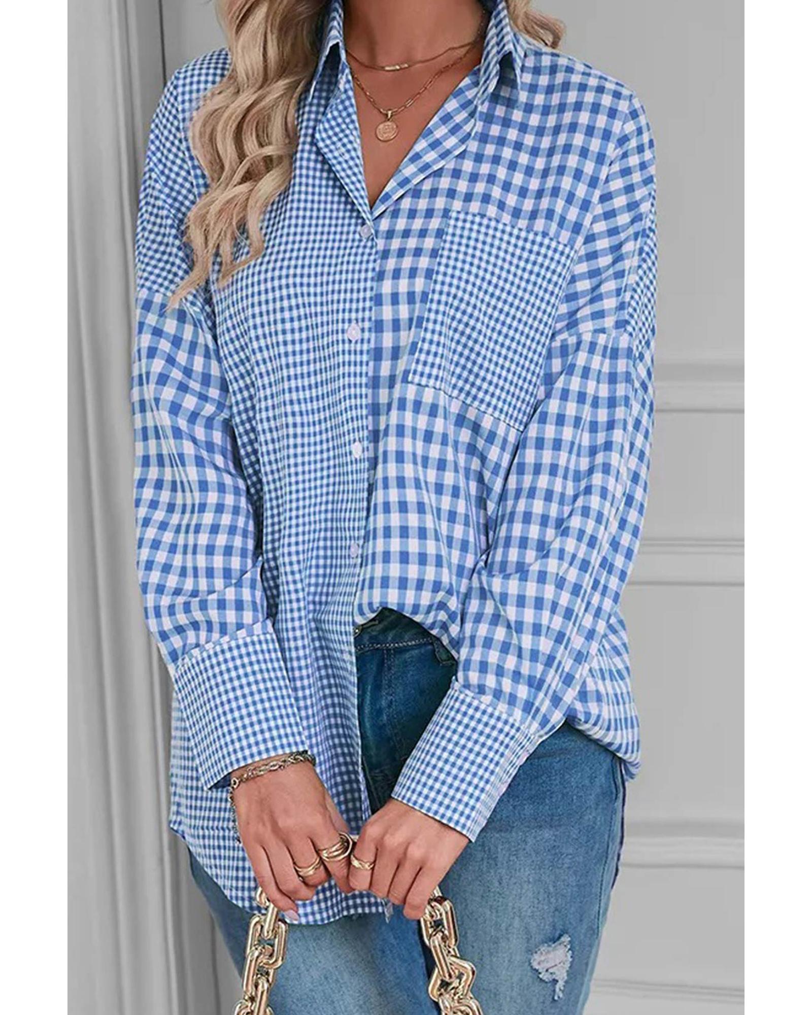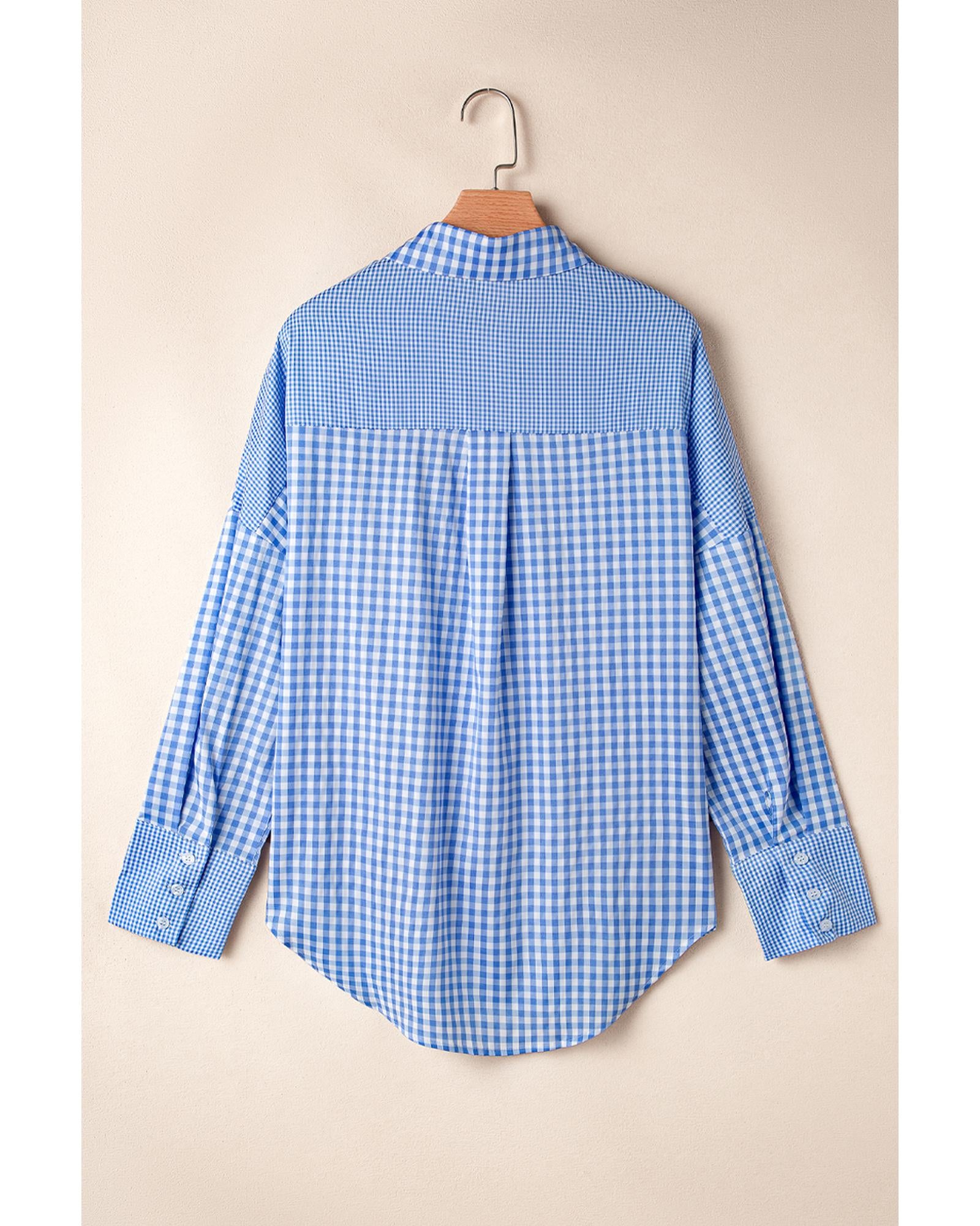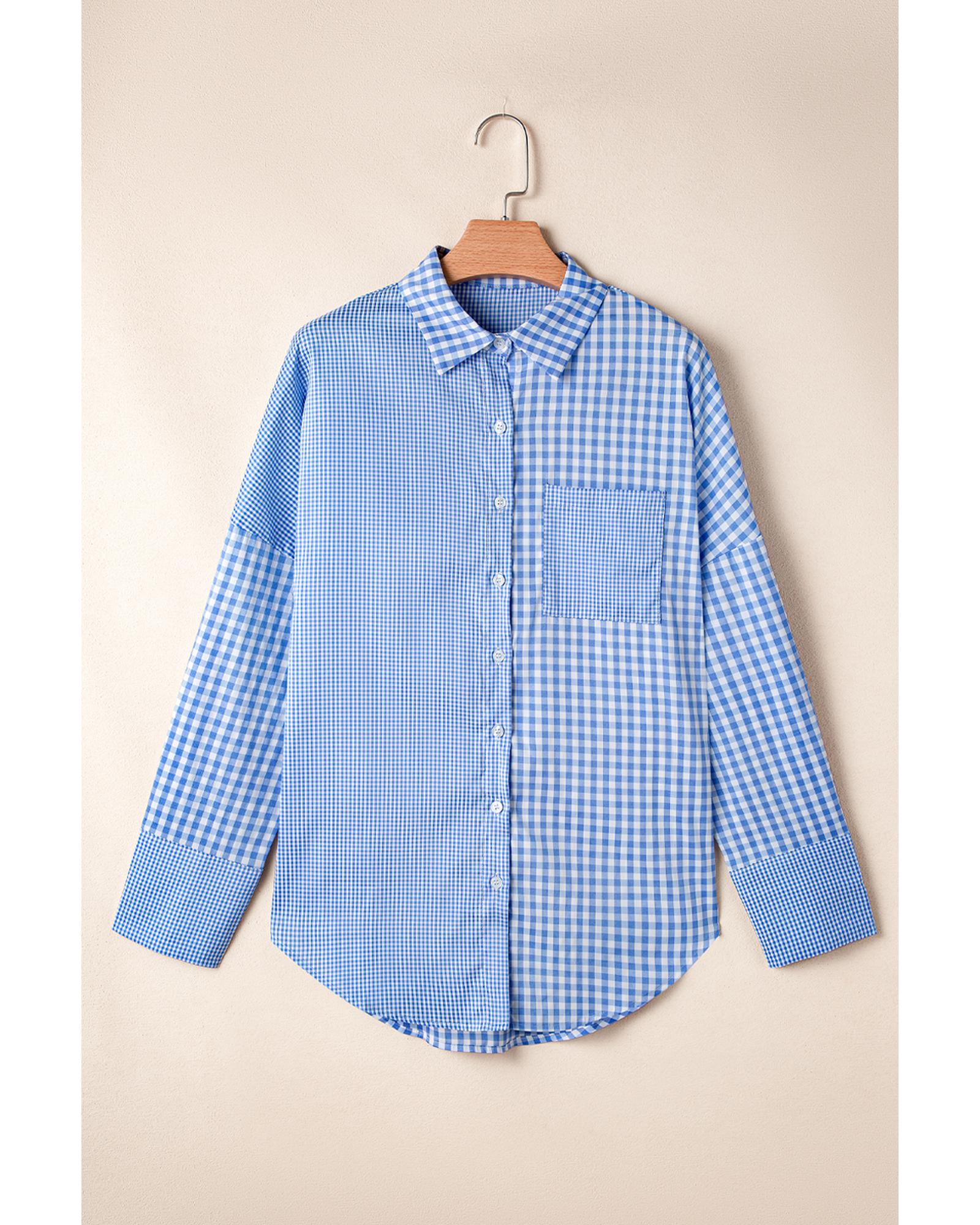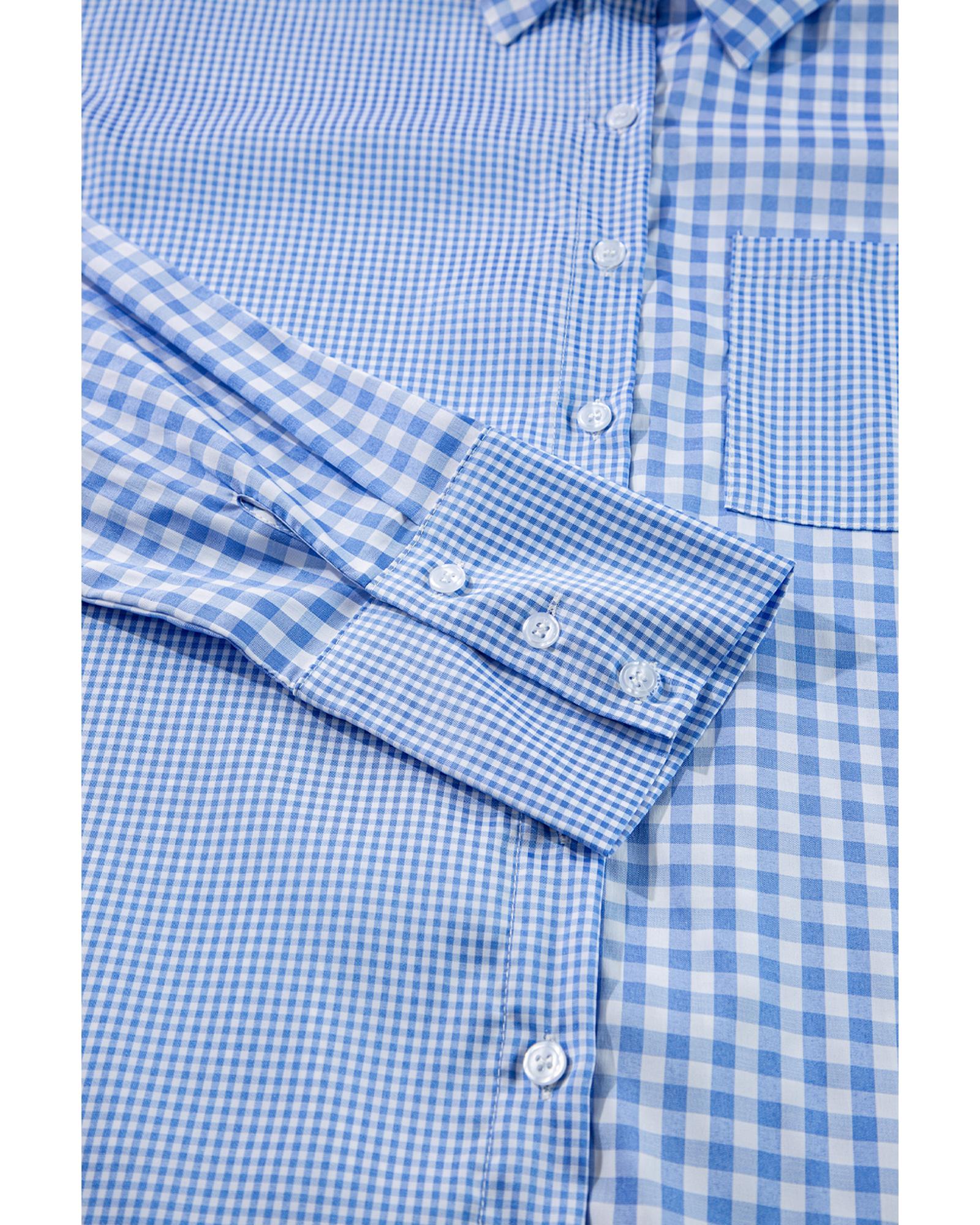Sky Blue Stripe Plaid Patchwork Button up Long Sleeve Shirt - XL