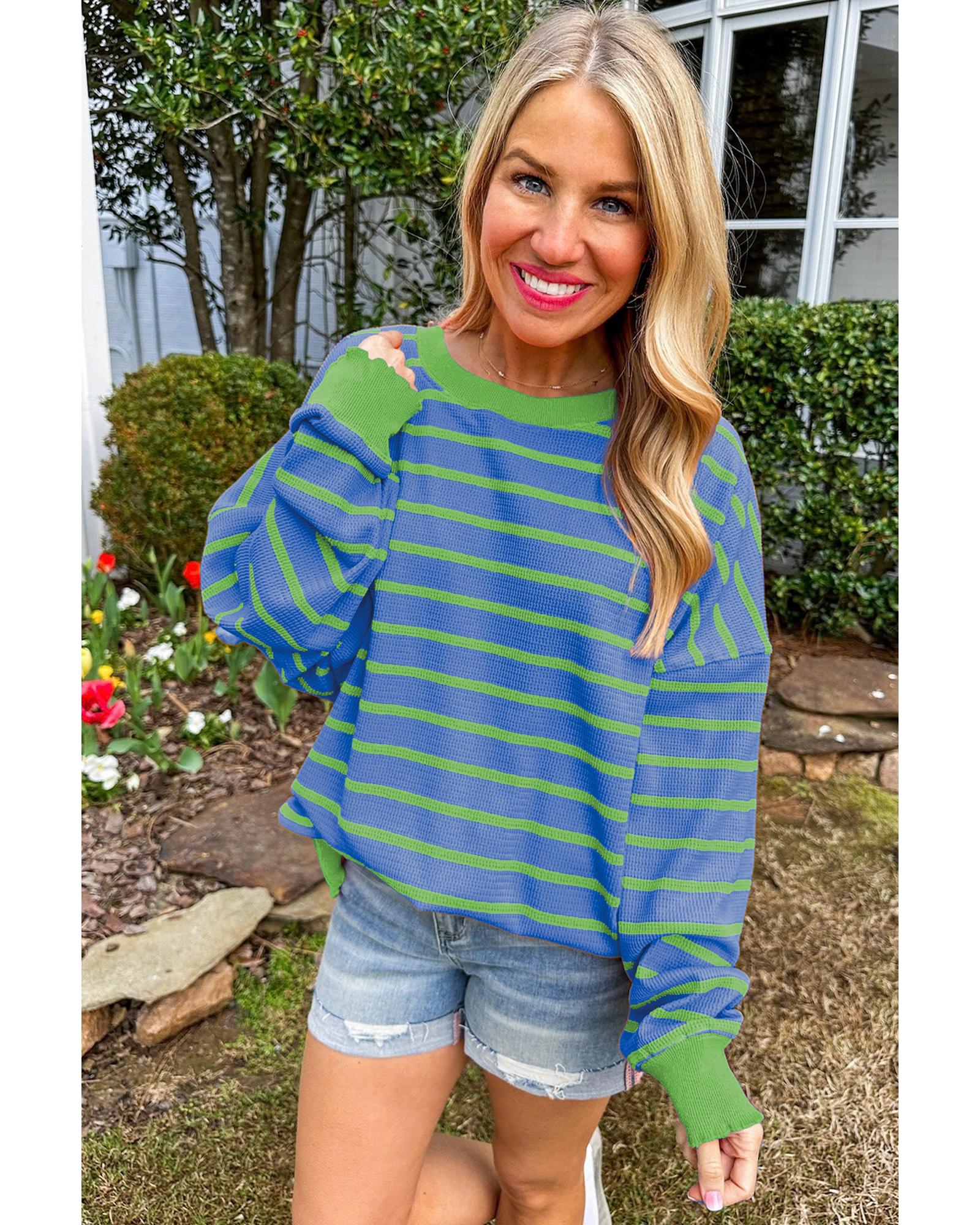 Sky Blue Stripe Trimmed Round Neck Drop Shoulder Loose Sweater - L