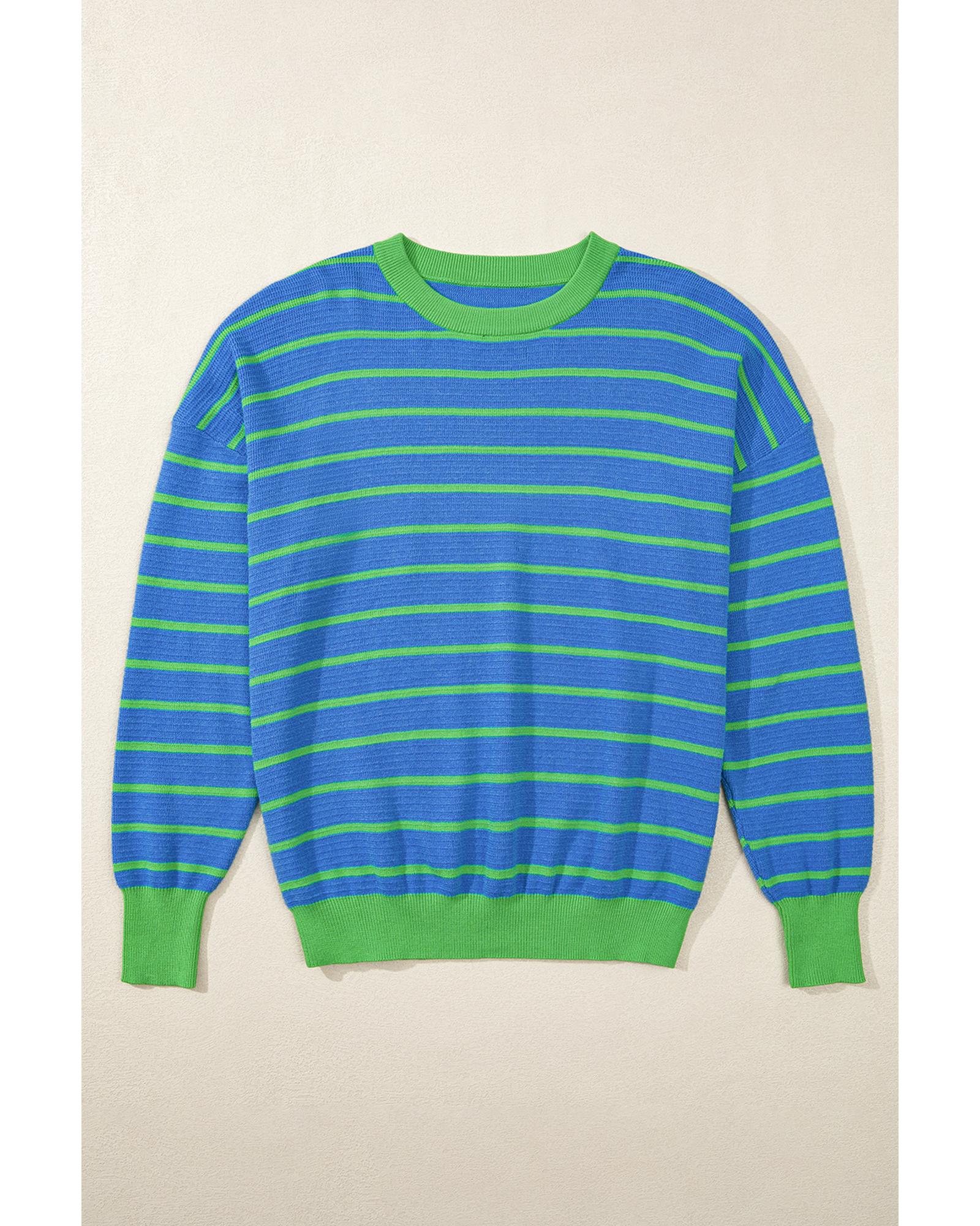 Sky Blue Stripe Trimmed Round Neck Drop Shoulder Loose Sweater - M
