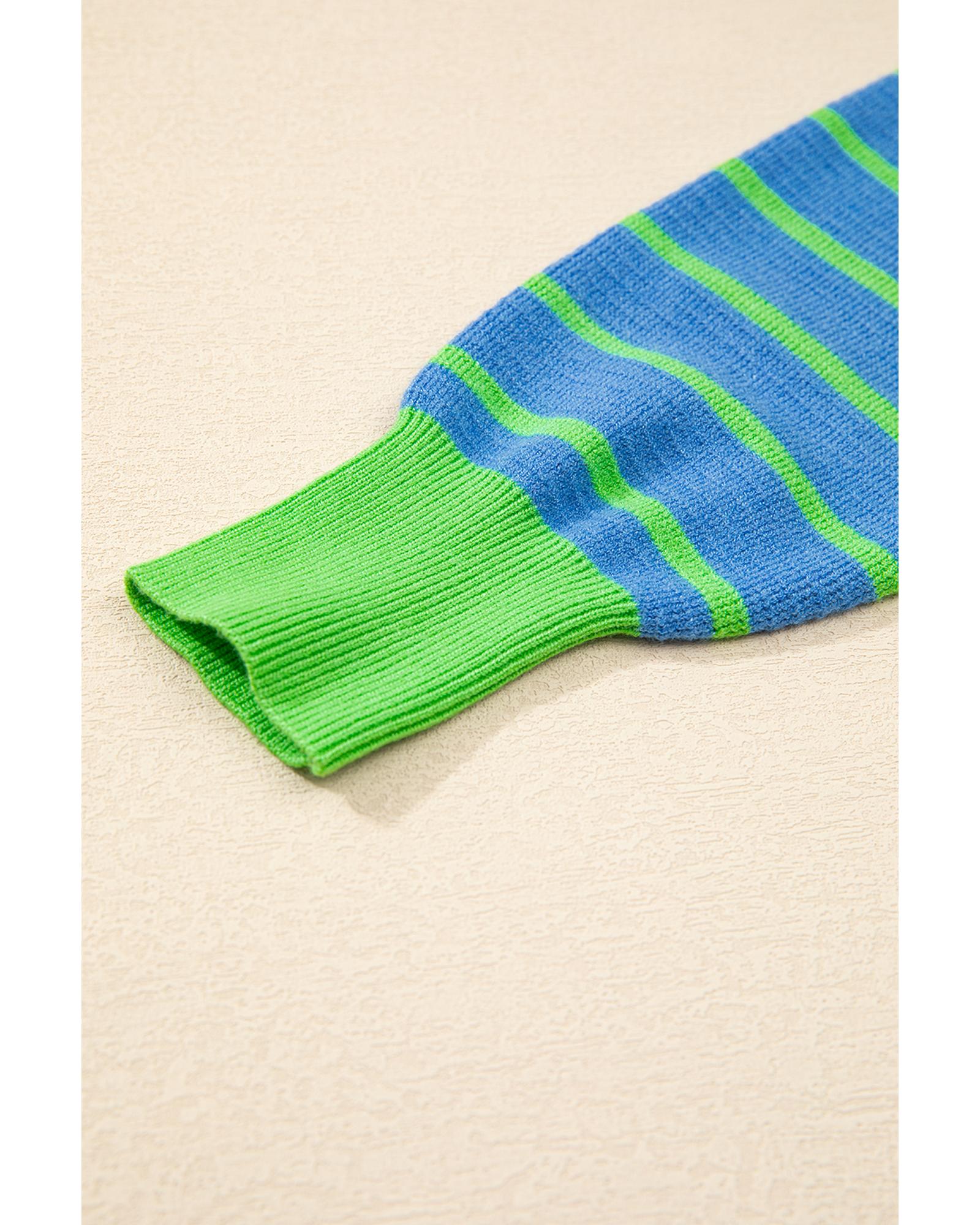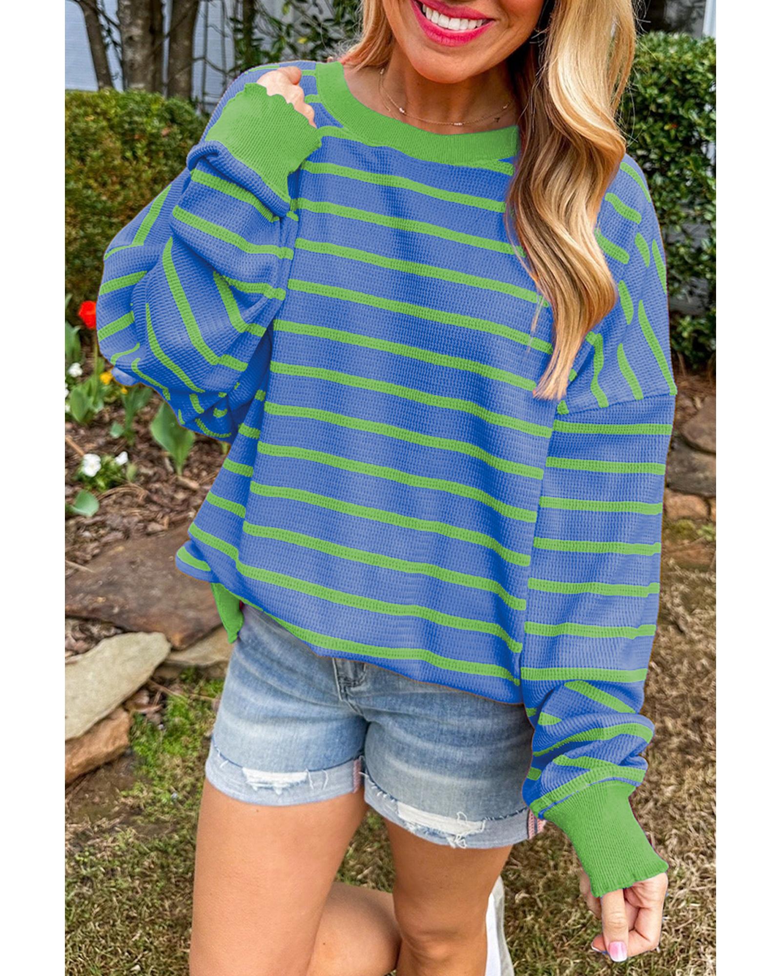 Sky Blue Stripe Trimmed Round Neck Drop Shoulder Loose Sweater - XL