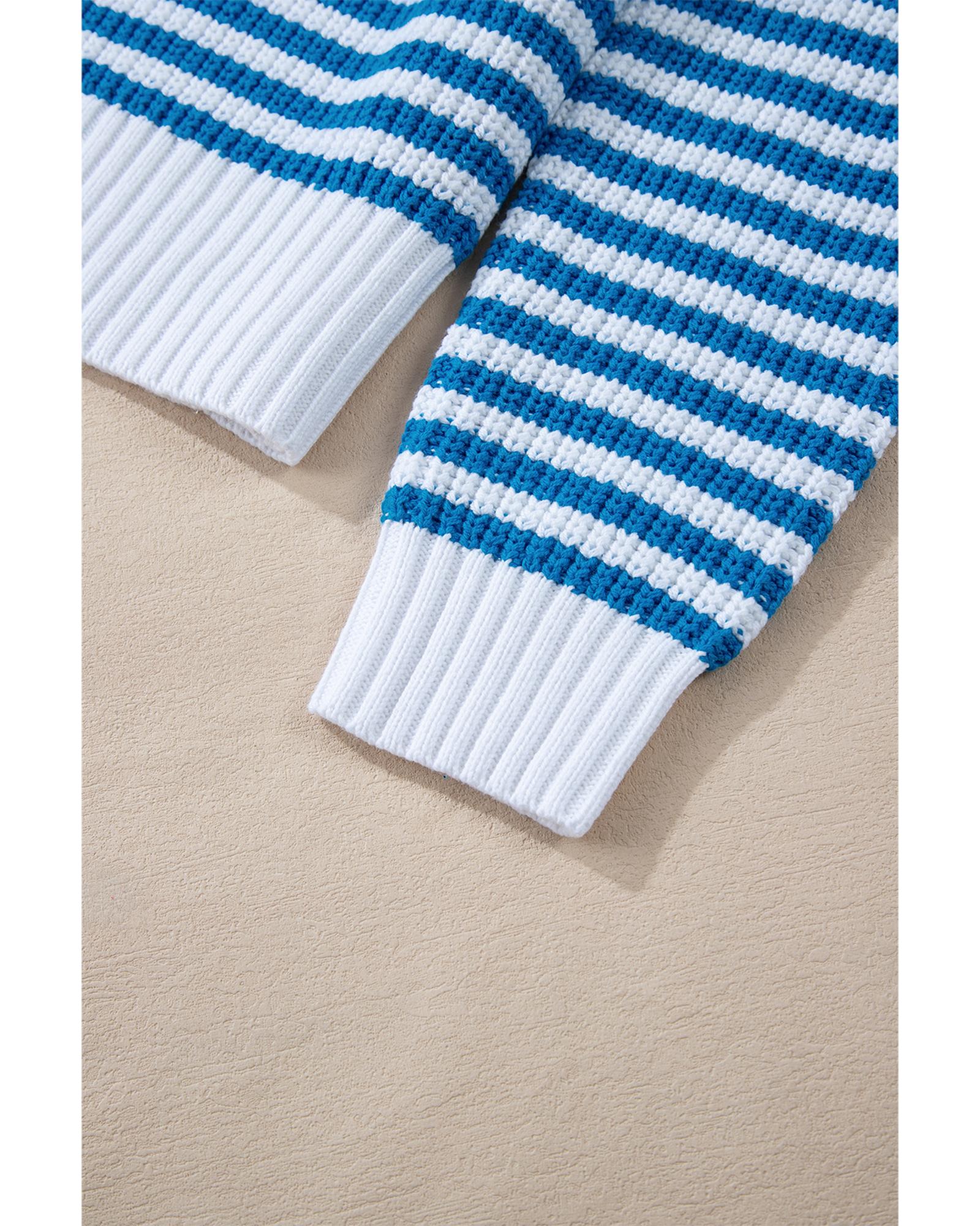 Sky Blue Stripe Zip up Collar Drop Shoulder Sweater - L
