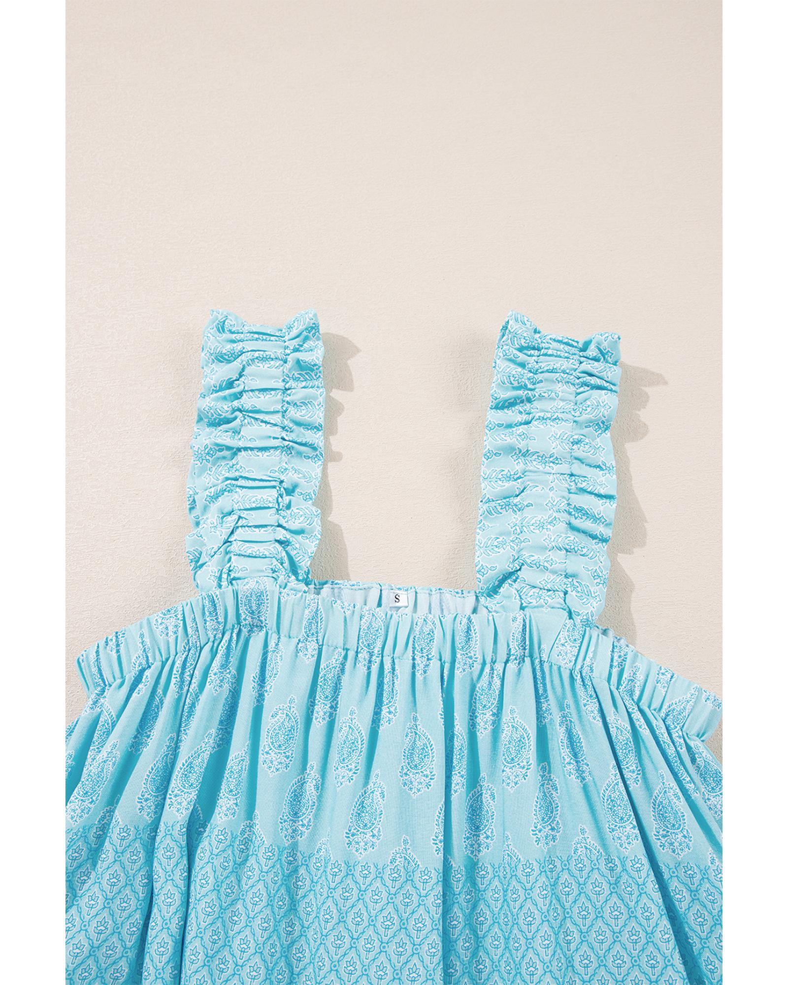 Sky Blue Tribal Pattern Print Ruffled Wide Straps Loose Tank Top - M