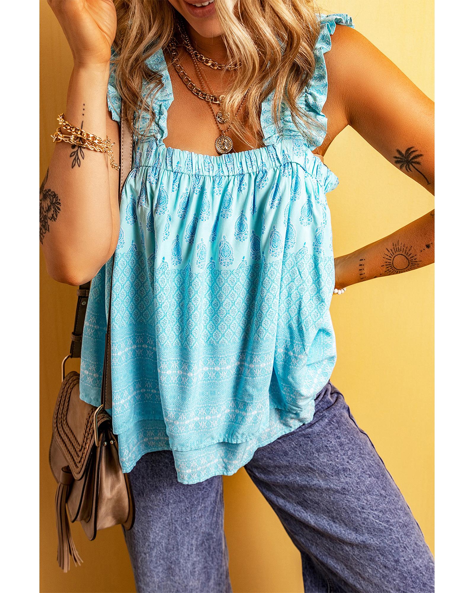 Sky Blue Tribal Pattern Print Ruffled Wide Straps Loose Tank Top - S