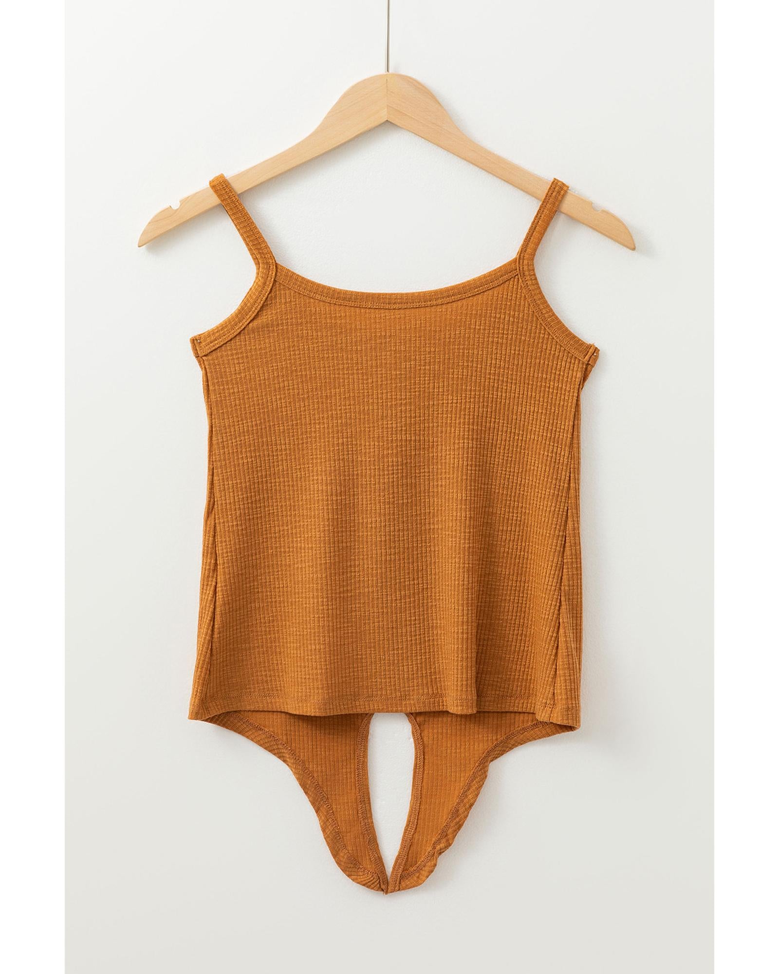 Straw Yellow Ribbed Front Knot Buttoned Thin Strap Tank Top - M