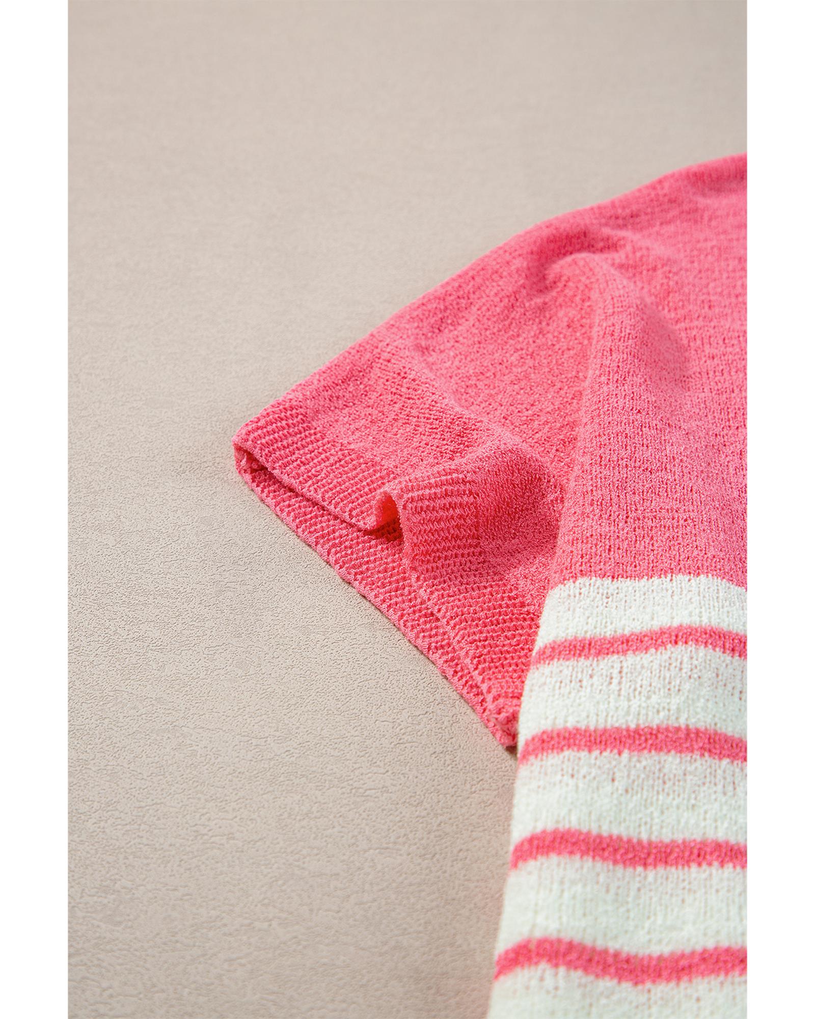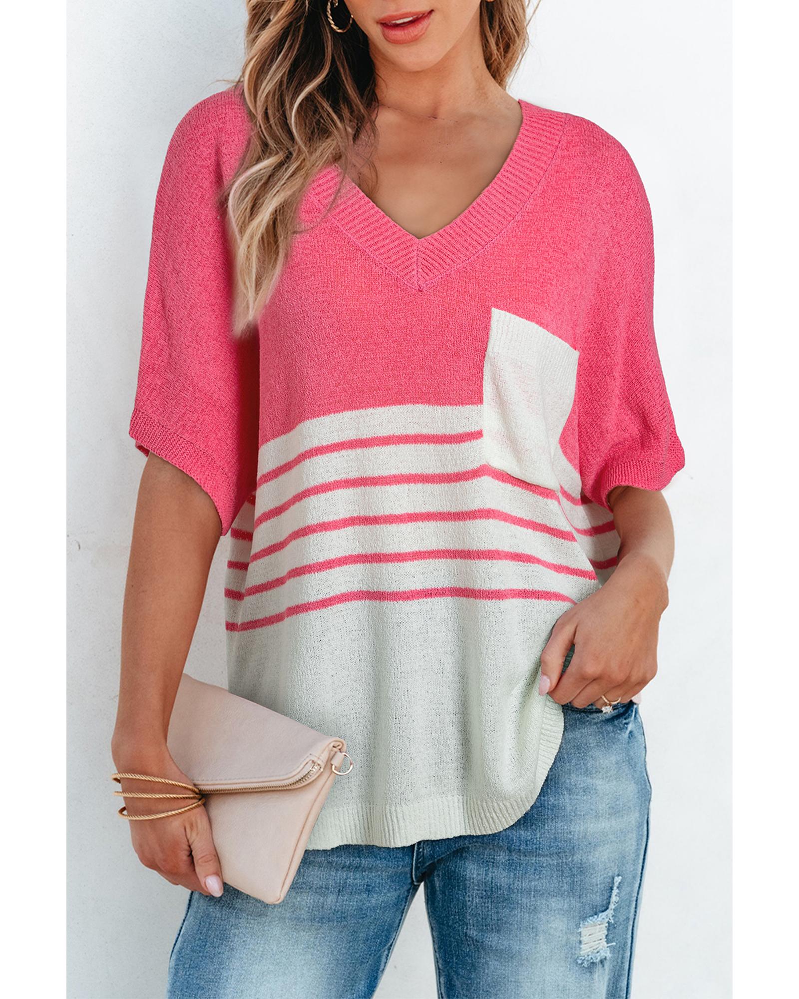 Strawberry Pink Contrast Stripes V Neck Knitted Short Sleeve Top - M