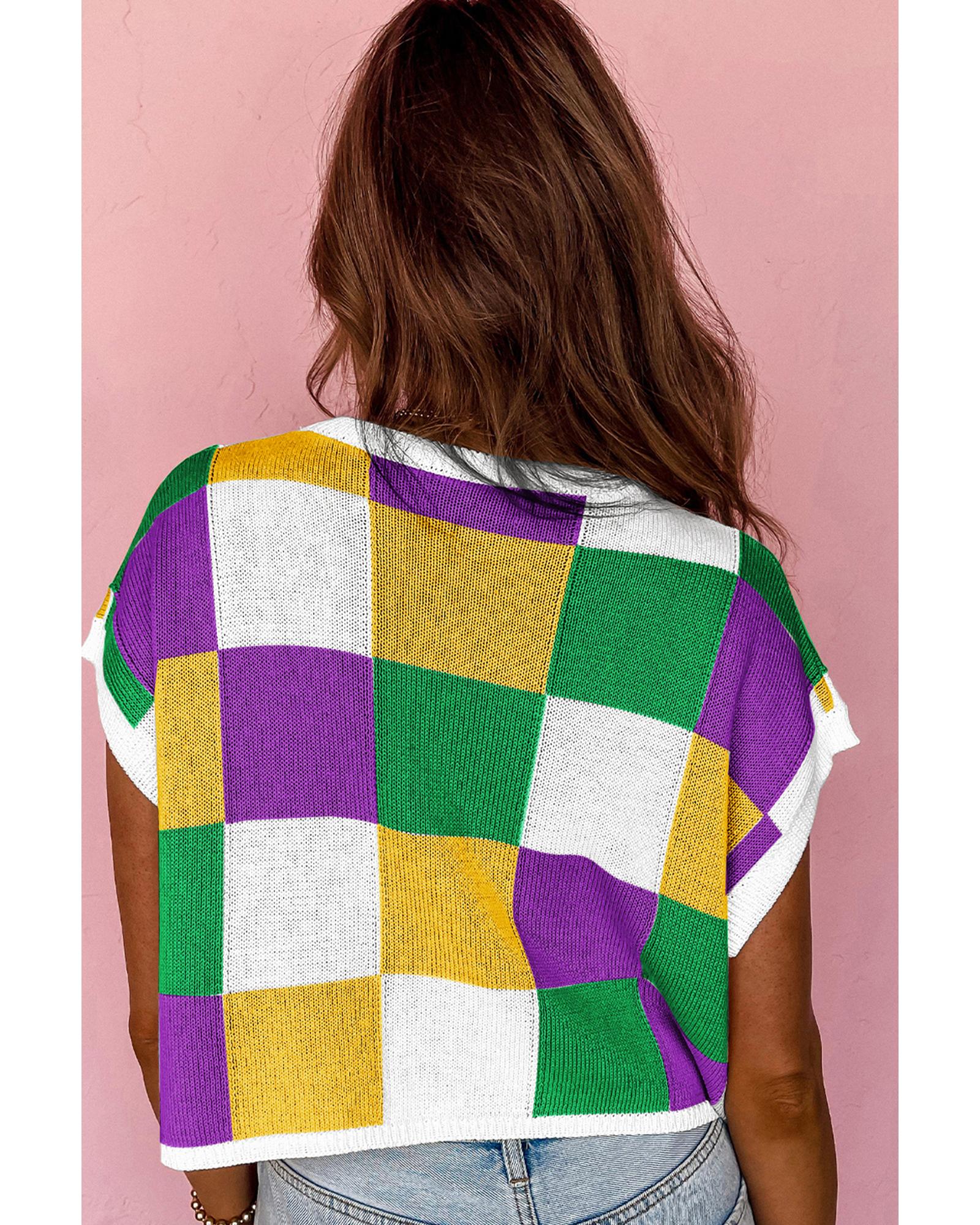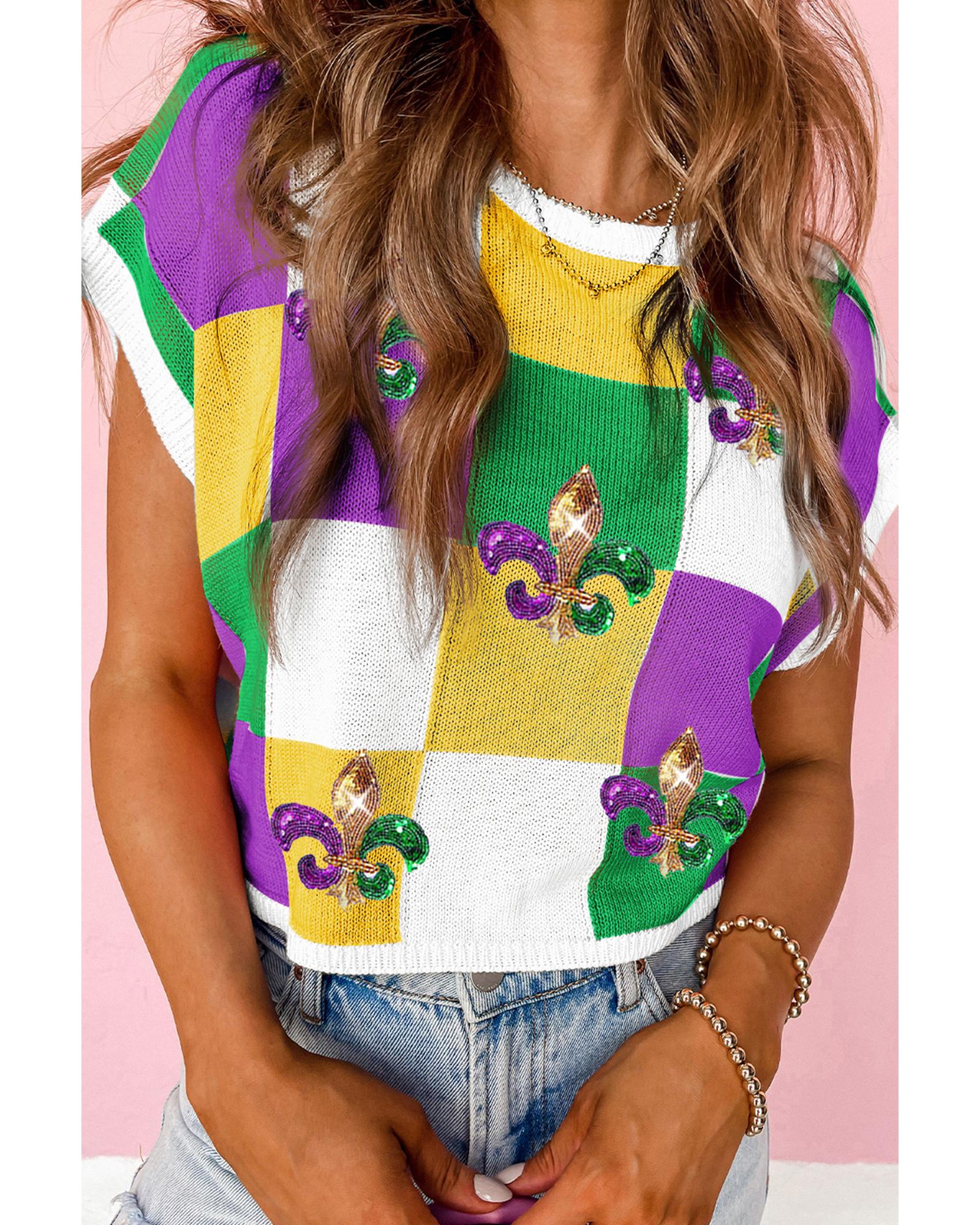 Tillandsia Purple Sequin Mardi Gras Fleur de Lis Color Block Sweater T Shirt - XL
