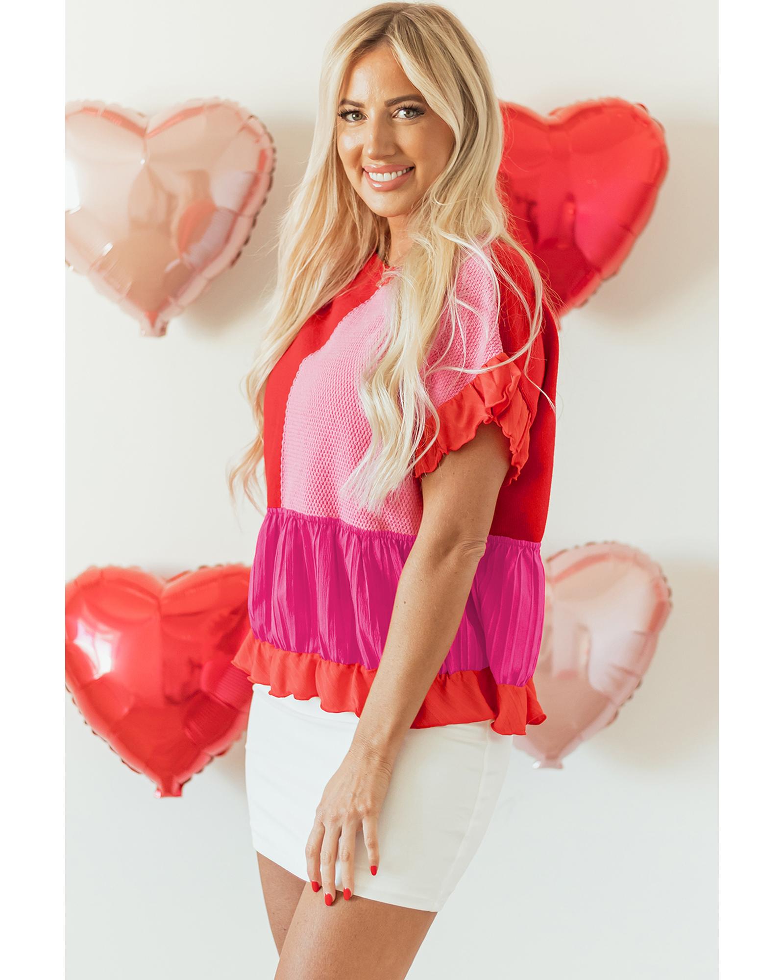 Tomato Red Mix Knitted Patchwork Ruffle Trim Loose Sweater - L