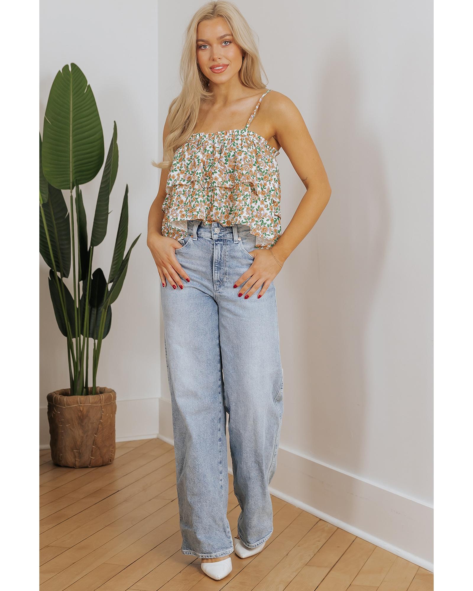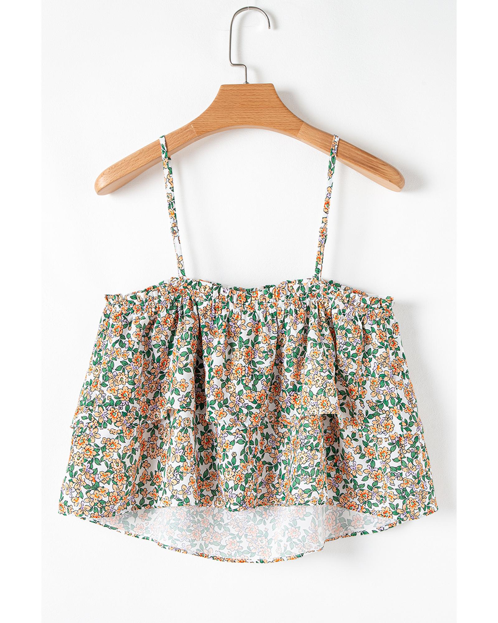 White Boho Floral Spaghetti Strap Ruffle Summer Tank Top - M