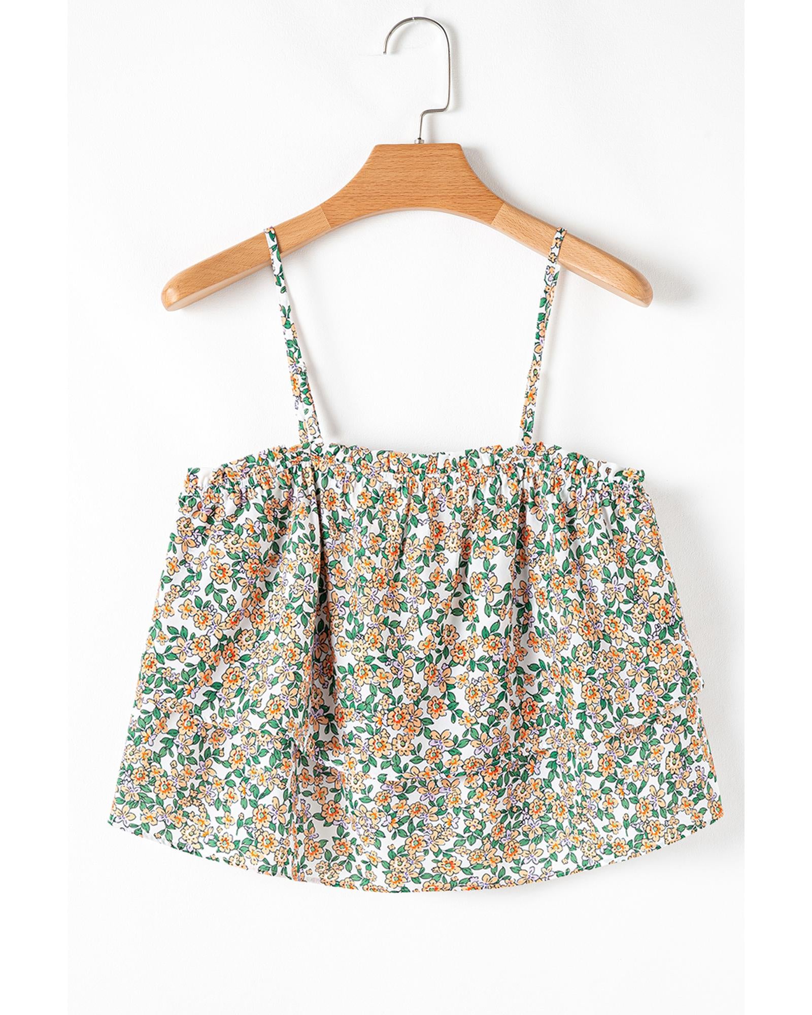 White Boho Floral Spaghetti Strap Ruffle Summer Tank Top - XL