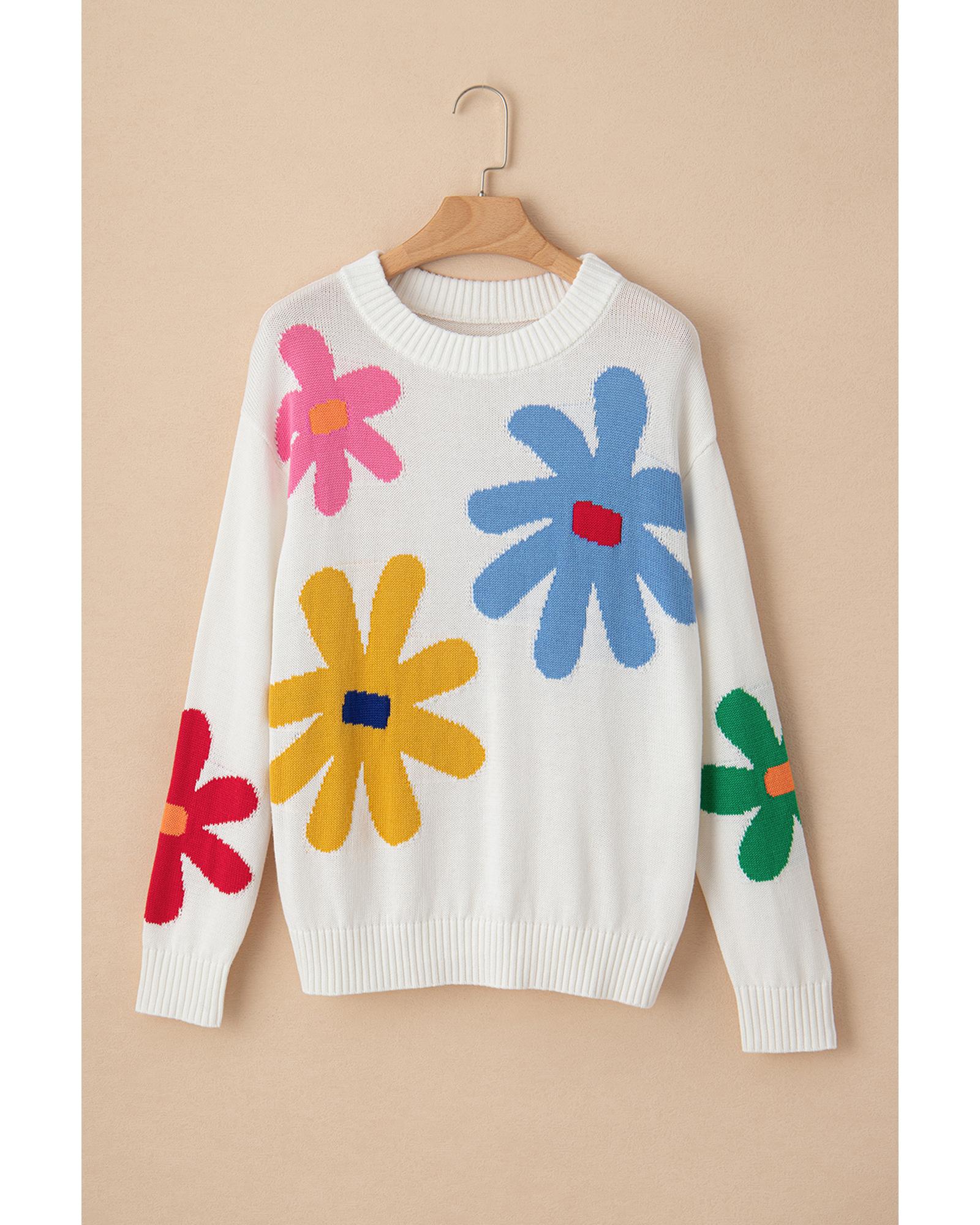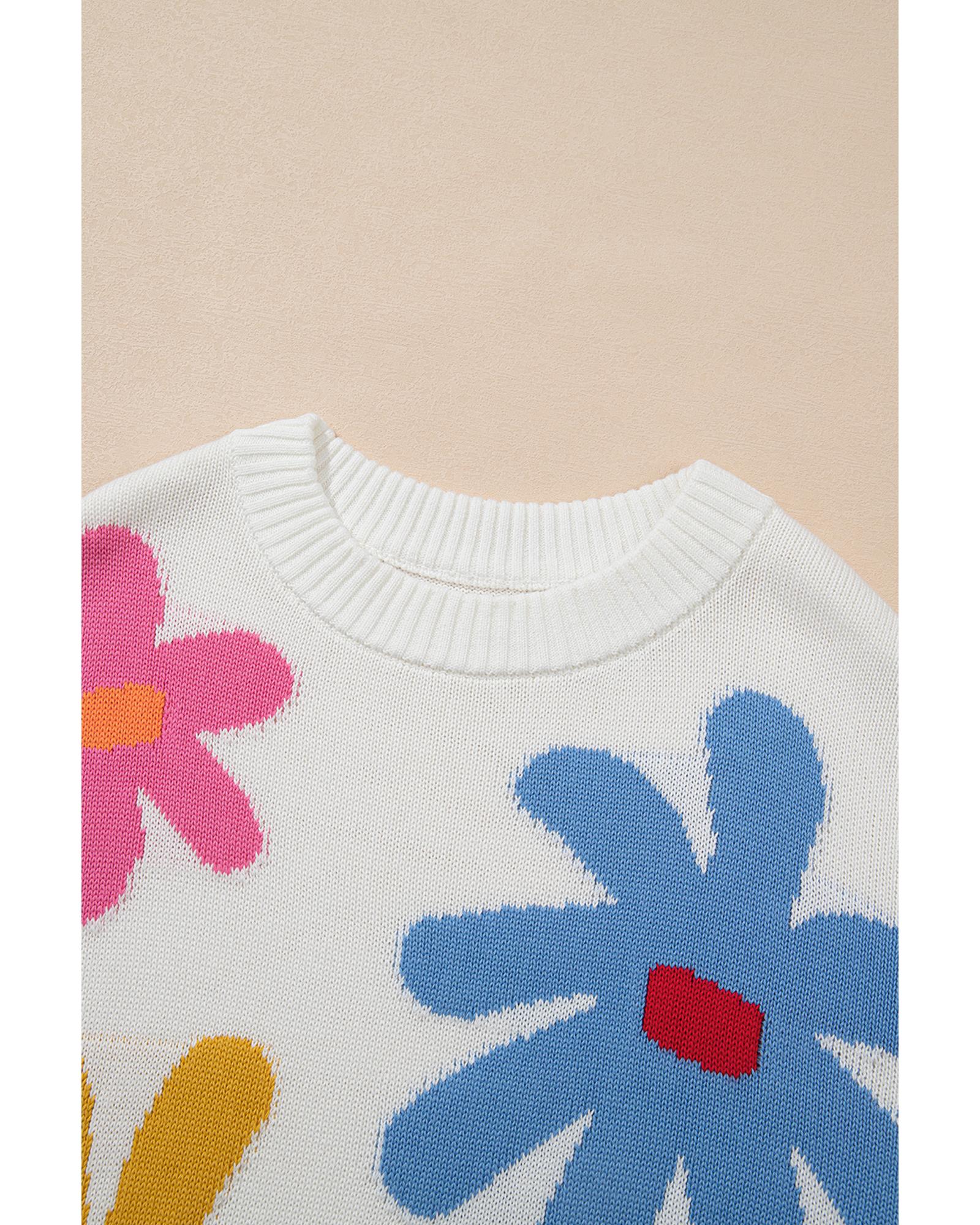 White Colorful Big Flower Pattern Crewneck Sweater - S