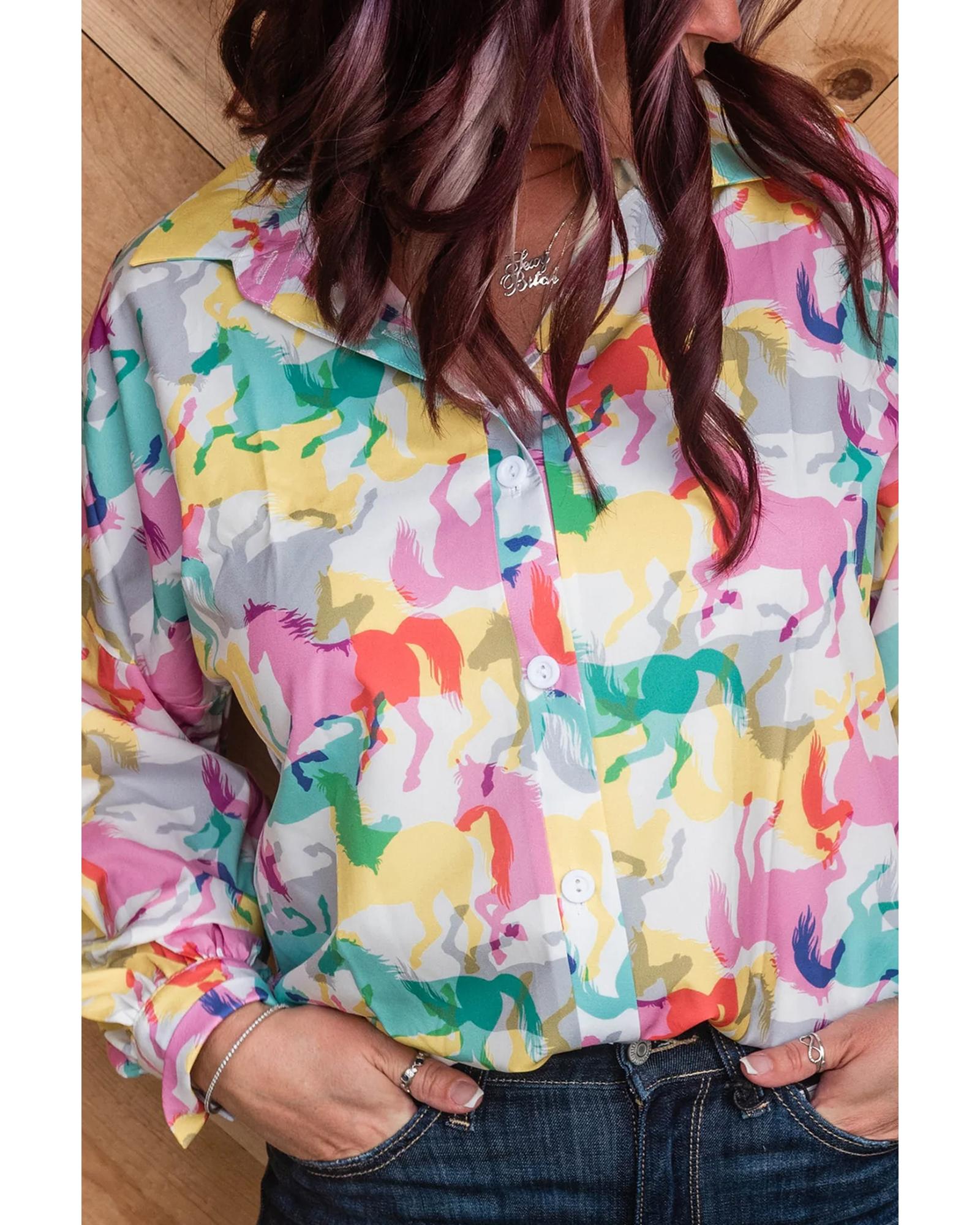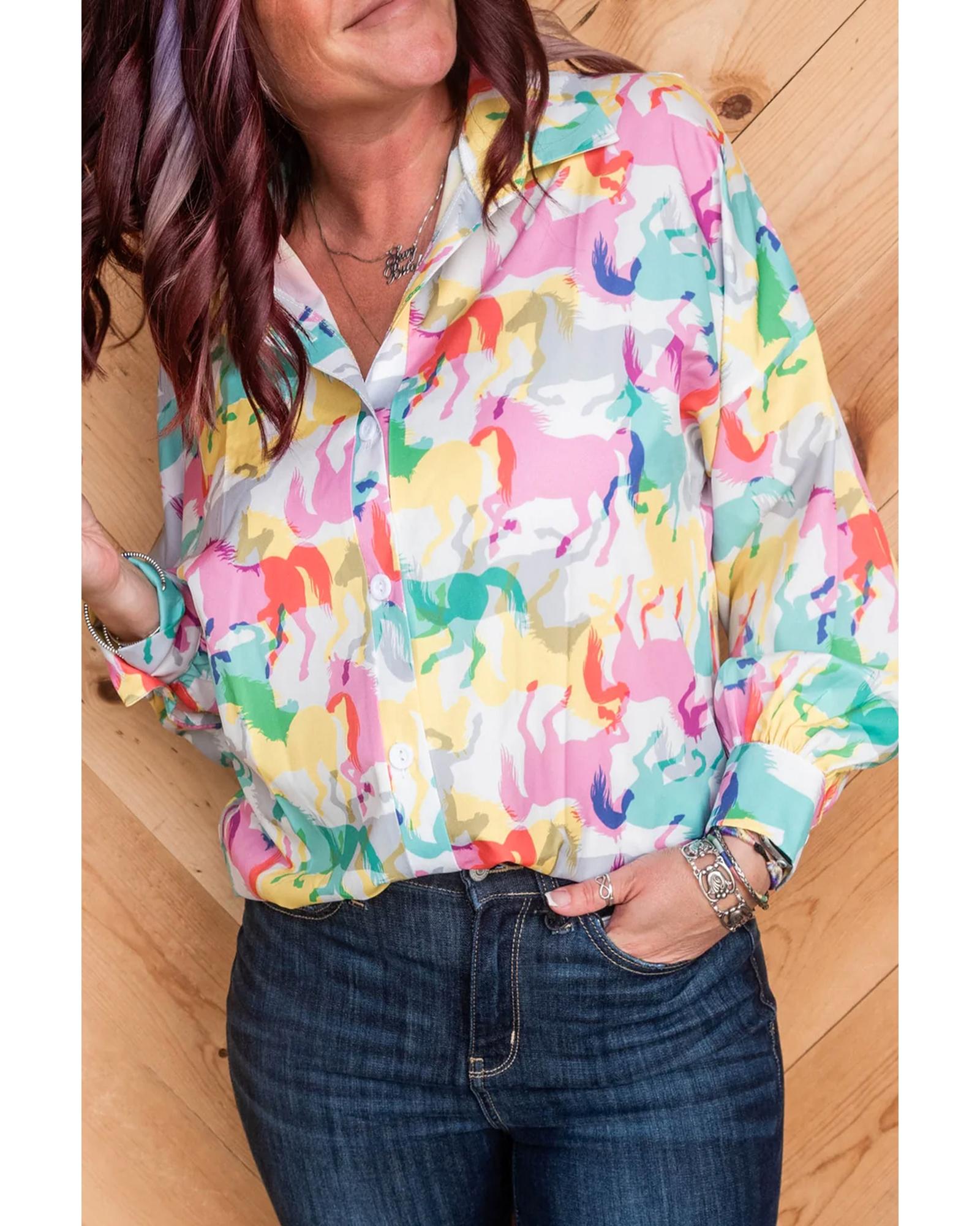 White Colorful Horse Printed Long Sleeve Button Up Casual Shirt - M
