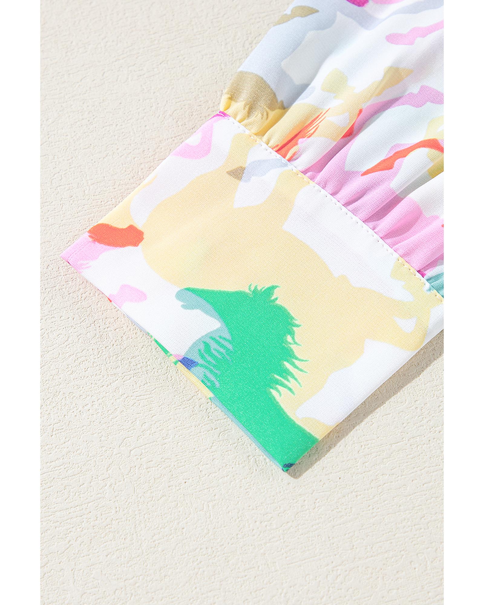 White Colorful Horse Printed Long Sleeve Button Up Casual Shirt - S