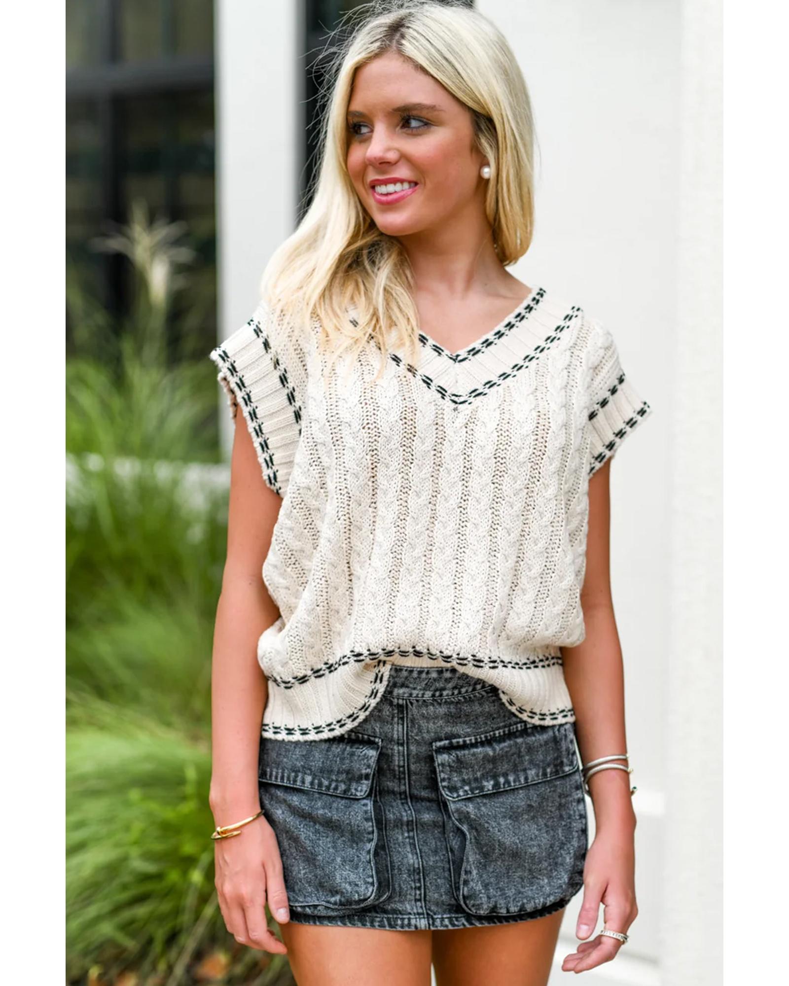 White Contrast Trim V Neck Cable Knit Sweater Vest - M
