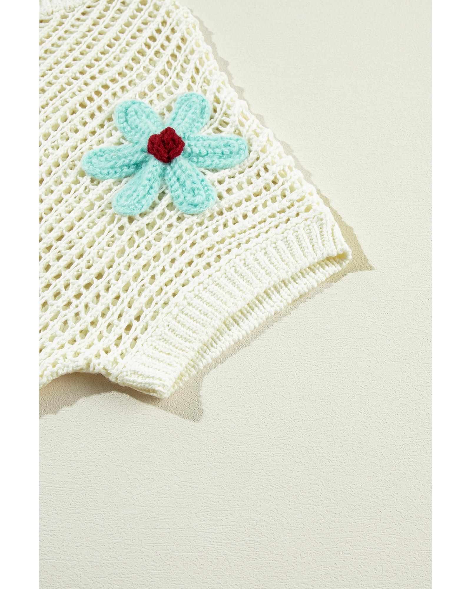 White Crochet Flower Hollow-out Sweater T Shirt - M