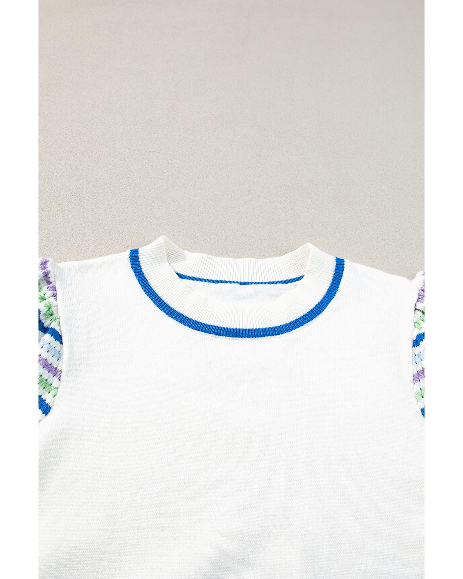 White Crochet Striped Bubble Sleeve Knit Sweater - S
