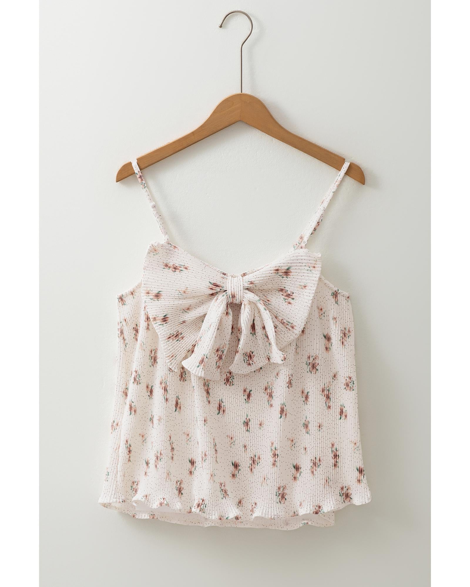 White Floral Pleated Big Bow Back Spaghetti Straps Tank Top - L
