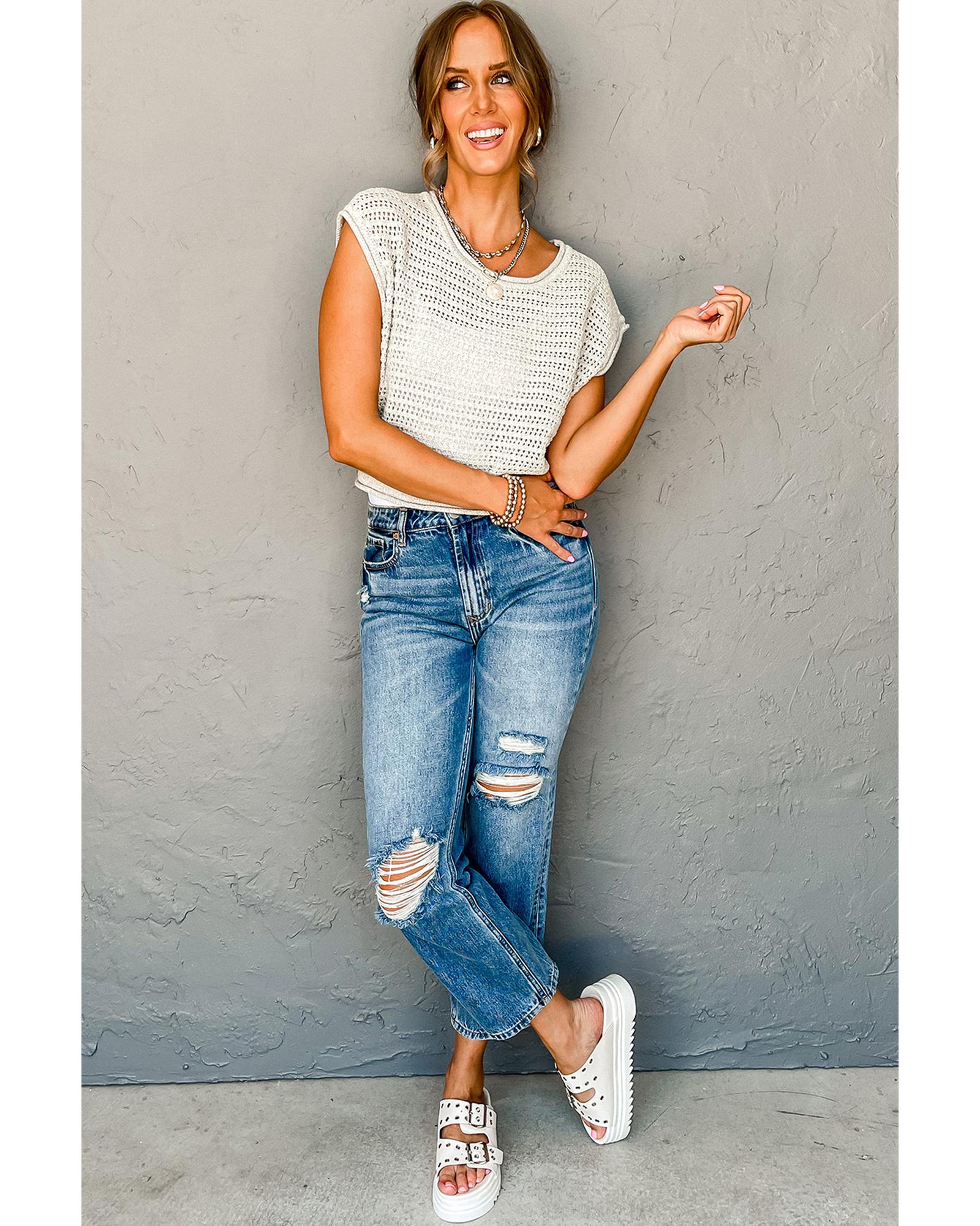 White Hollow Out Knit Cap Sleeve Sweater - XL