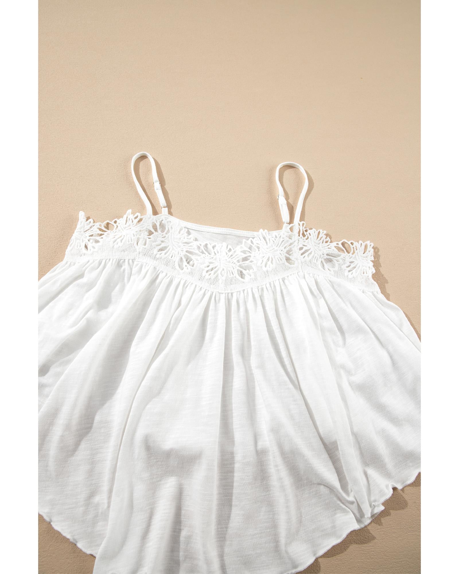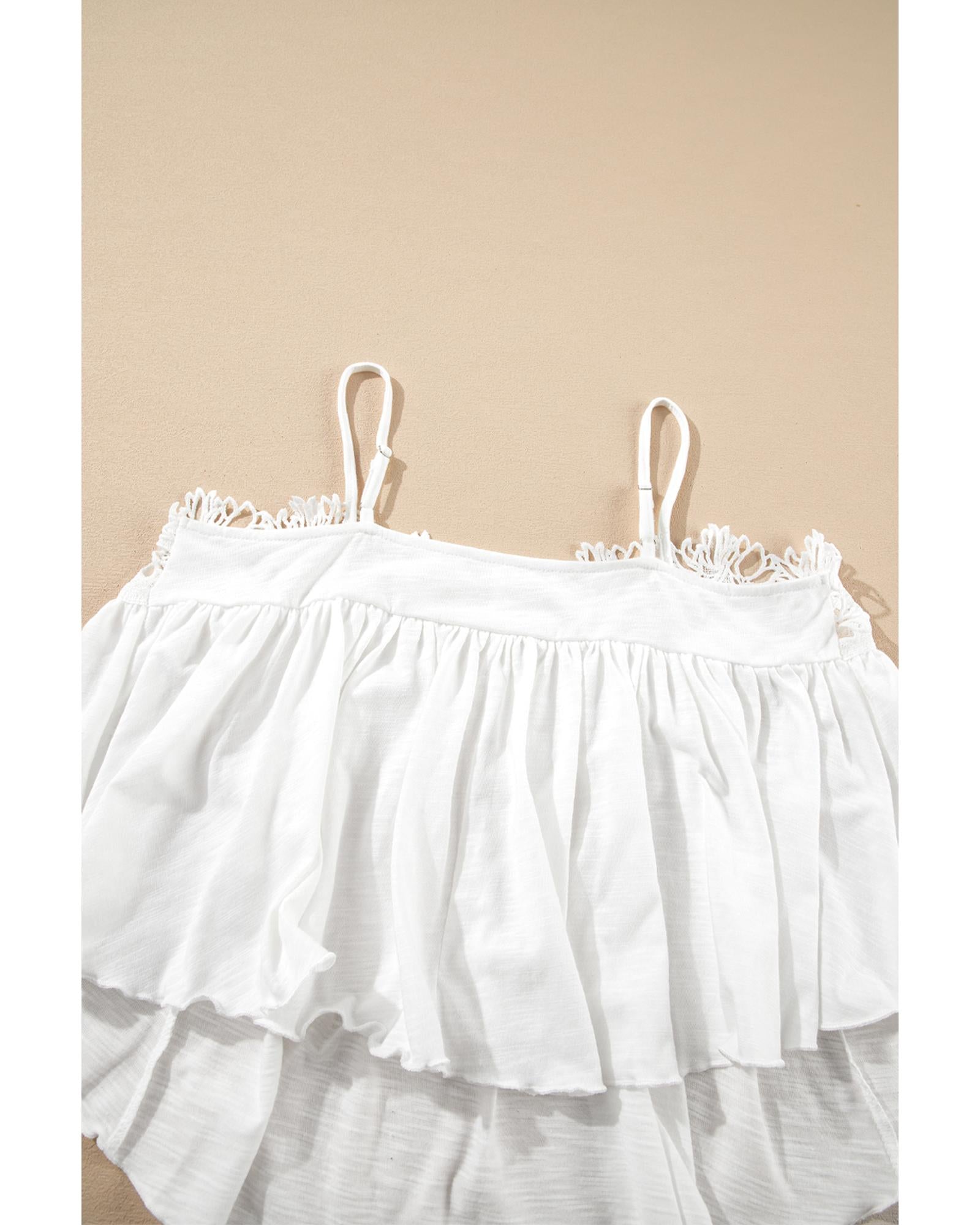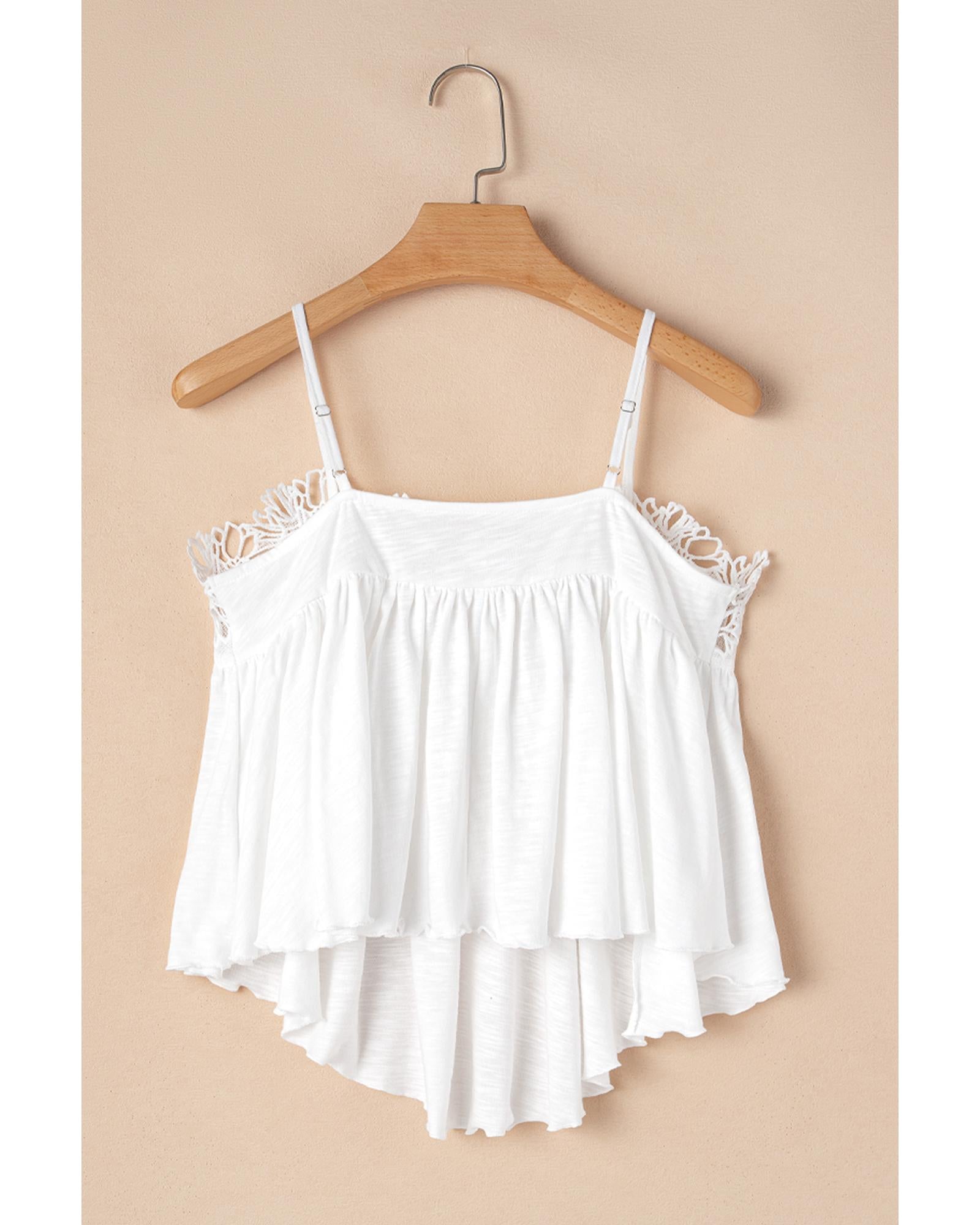 White Lace Splicing Spaghetti Straps Ruffle Flared Tank Top - XL