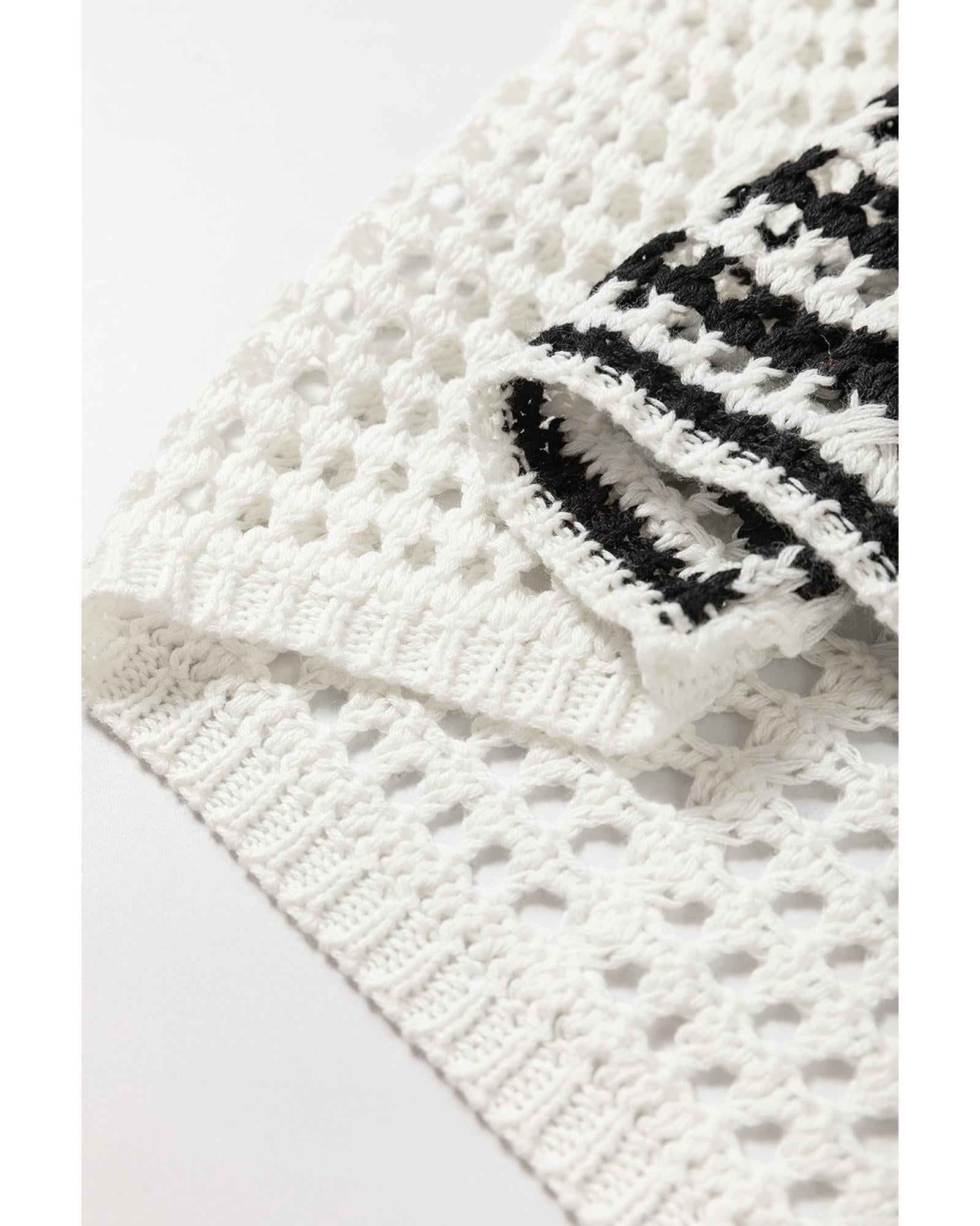 White Stripe Contrast Striped Crochet Puff Sleeve Sweater - M