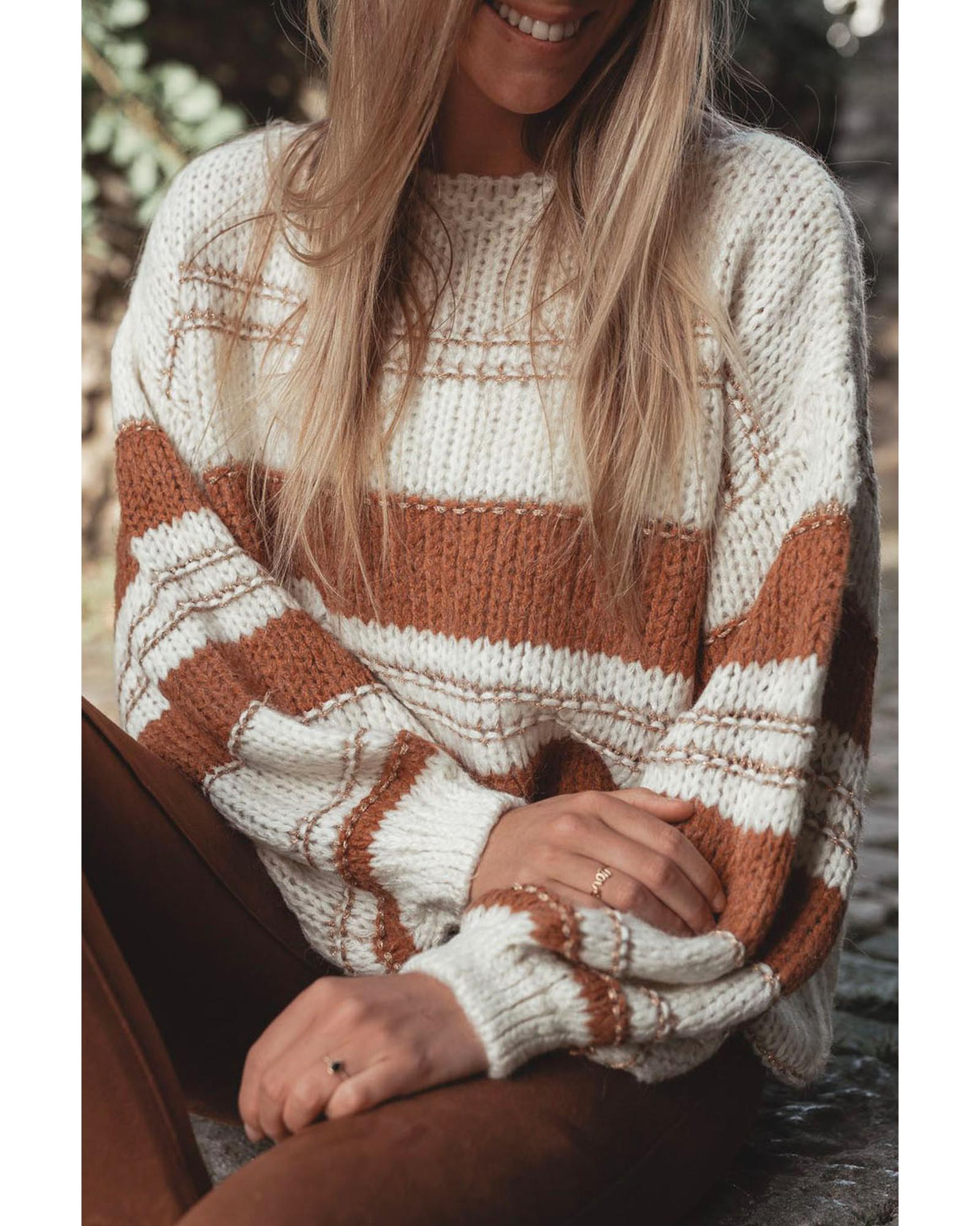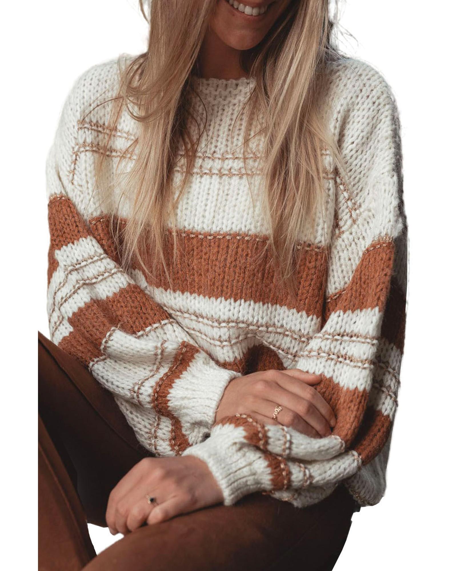 White Striped Knit Puff Sleeve Casual Sweater - M