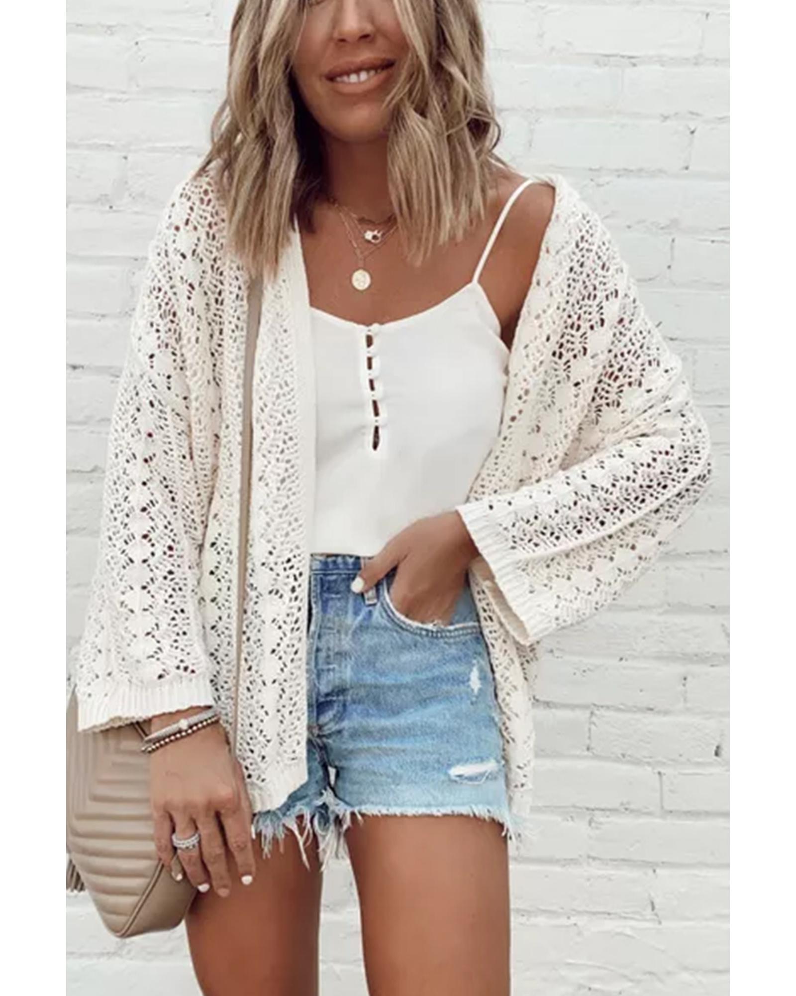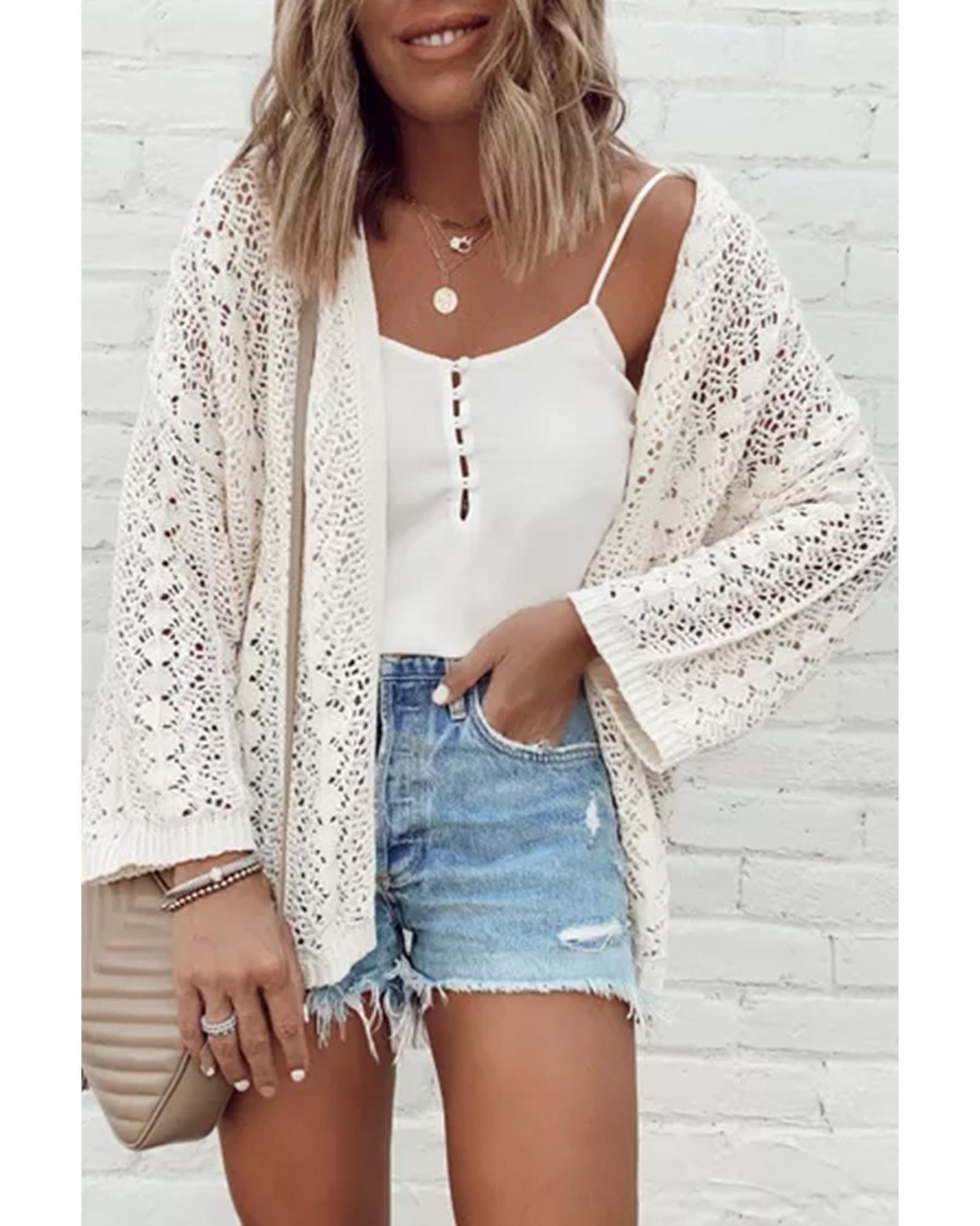 White Stylish Hollow Out Knit Drop Shoulder Cardigan - L