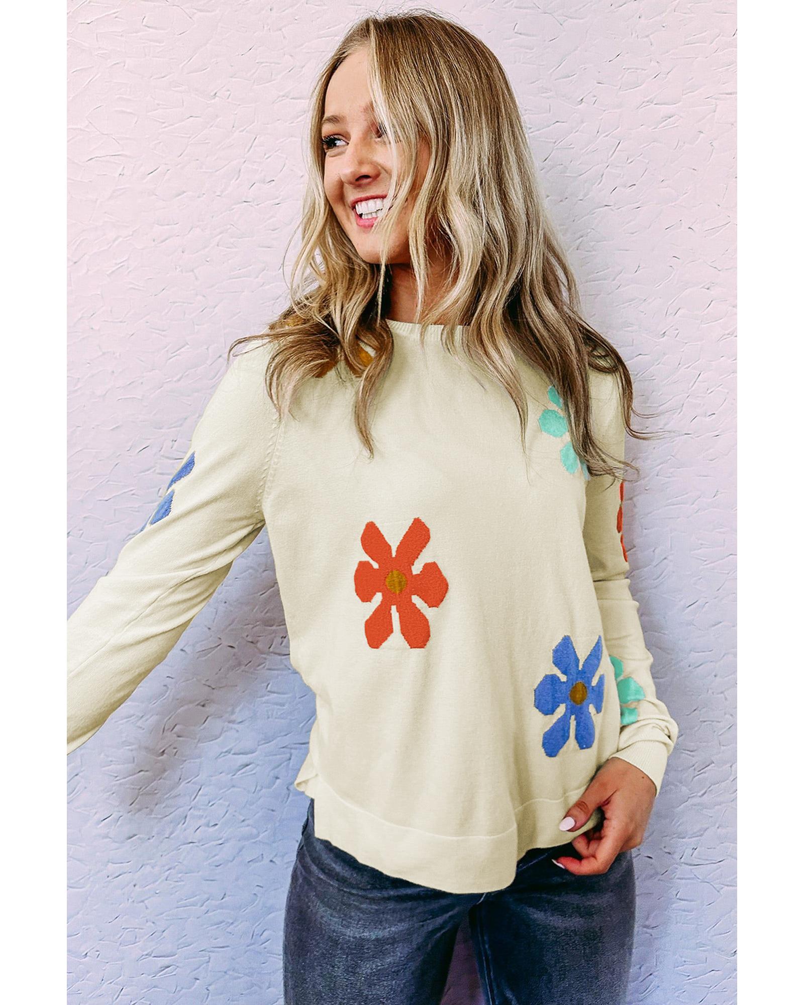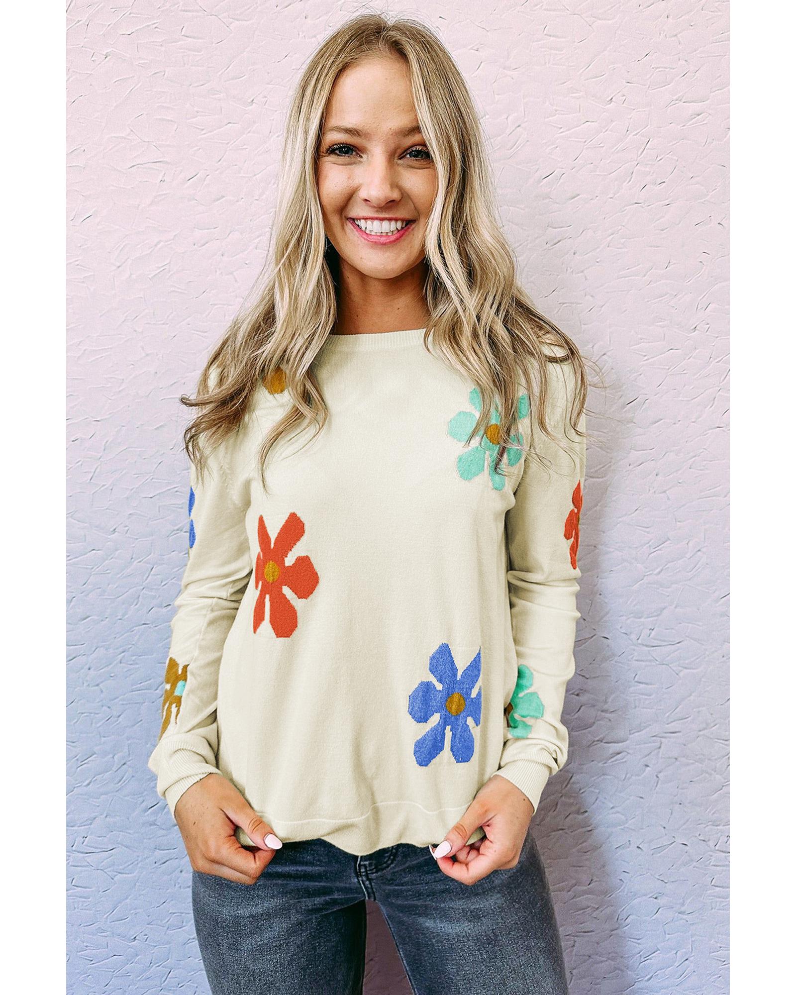 White Sweet Floral Pullover Sweater - L