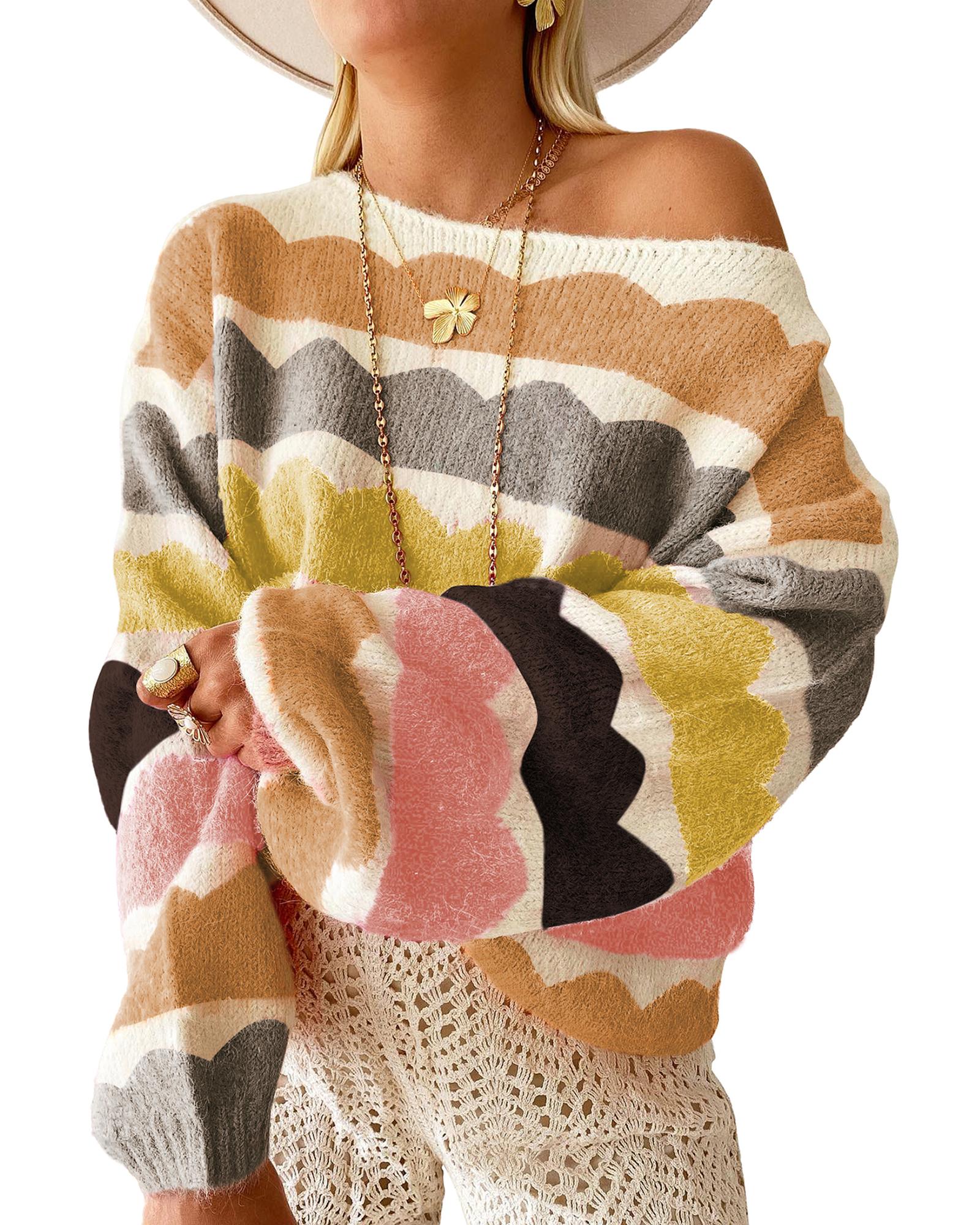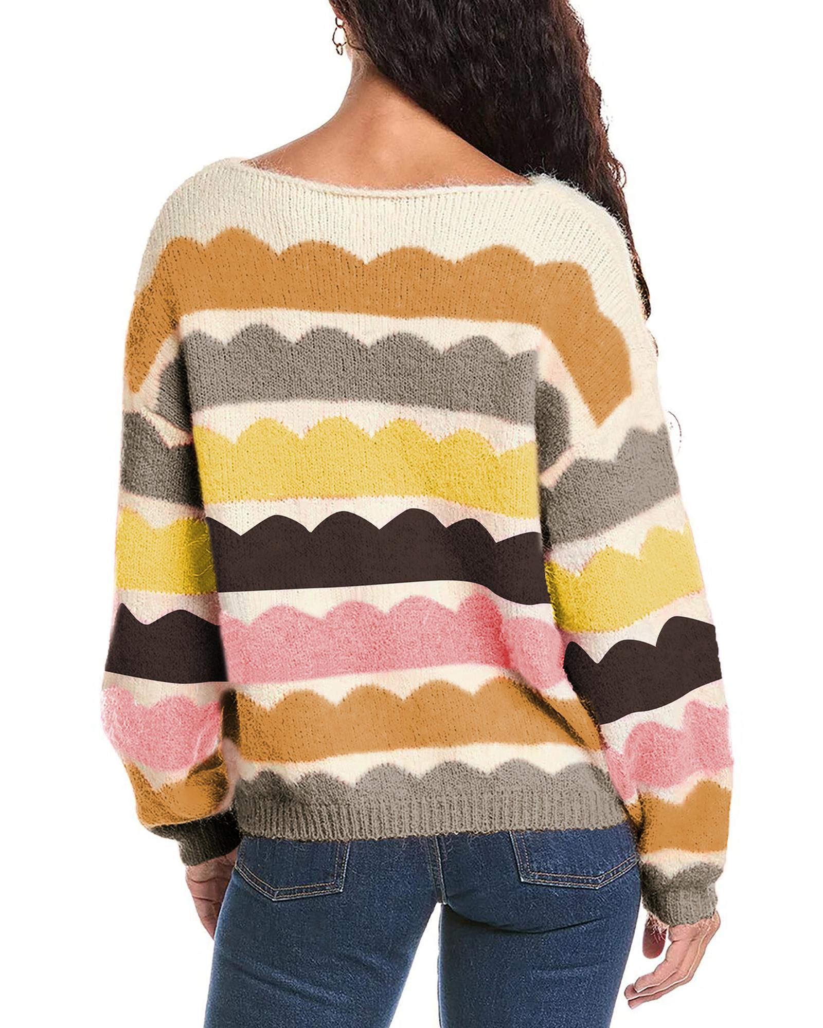 Yellow Wave Striped Balloon Sleeve Drop Shoulder Sweater - XL