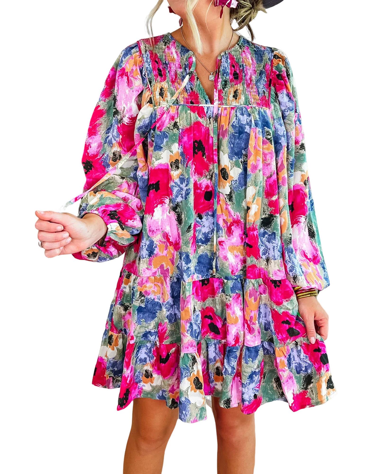 Multicolour Floral Tie Neck Bubble Sleeve Shift Dress - L